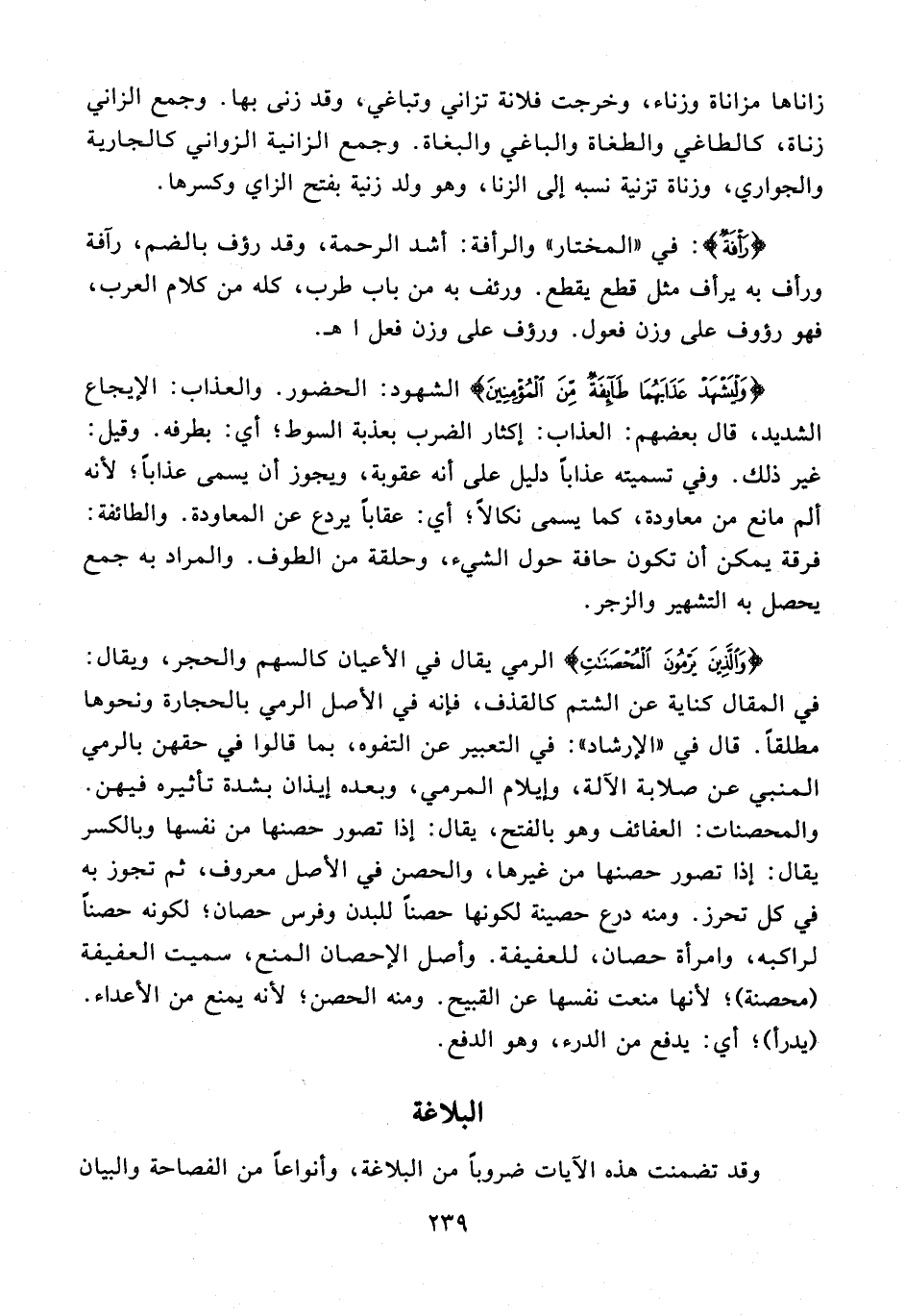 {وَلْيَشْهَدْ عَذَابَهُمَا طَائِفَةٌ مِنَ الْمُؤْمِنِينَ} الشهود: الحضور. والعذاب: الإيجاع الشديد، قال بعضهم: العذاب: إكثار الضرب بعذبة السوط؛ أي: بطرفه. وقيل: غير ذلك. وفي تسميته عذابًا دليل على أنه عقوبة، ويجوز أن يسمى عذابًا؛ لأنه ألم مانع من معاودة، كما يسمى نكالًا؛ أي: عقابًا يردع عن المعاودة. والطائفة: فرقة يمكن أن تكون حافة حول الشيء، وحلقة من الطوف. والمراد به جمع يحصل به التشهير والزجر.