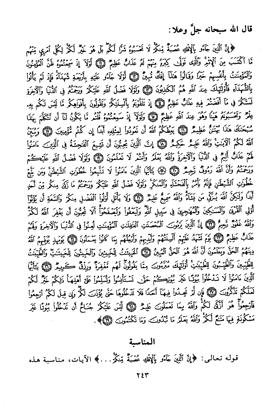 {إِنَّ الَّذِينَ جَاءُوا بِالْإِفْكِ عُصْبَةٌ مِنْكُمْ لَا تَحْسَبُوهُ شَرًّا لَكُمْ بَلْ هُوَ خَيْرٌ لَكُمْ لِكُلِّ امْرِئٍ مِنْهُمْ مَا اكْتَسَبَ مِنَ الْإِثْمِ وَالَّذِي تَوَلَّى كِبْرَهُ مِنْهُمْ لَهُ عَذَابٌ عَظِيمٌ (11) لَوْلَا إِذْ سَمِعْتُمُوهُ ظَنَّ الْمُؤْمِنُونَ وَالْمُؤْمِنَاتُ بِأَنْفُسِهِمْ خَيْرًا وَقَالُوا هَذَا إِفْكٌ مُبِينٌ (12) لَوْلَا جَاءُوا عَلَيْهِ بِأَرْبَعَةِ شُهَدَاءَ فَإِذْ لَمْ يَأْتُوا بِالشُّهَدَاءِ فَأُولَئِكَ عِنْدَ اللَّهِ هُمُ الْكَاذِبُونَ (13) وَلَوْلَا فَضْلُ اللَّهِ عَلَيْكُمْ وَرَحْمَتُهُ فِي الدُّنْيَا وَالْآخِرَةِ لَمَسَّكُمْ فِي مَا أَفَضْتُمْ فِيهِ عَذَابٌ عَظِيمٌ (14) إِذْ تَلَقَّوْنَهُ بِأَلْسِنَتِكُمْ وَتَقُولُونَ بِأَفْوَاهِكُمْ مَا لَيْسَ لَكُمْ بِهِ عِلْمٌ وَتَحْسَبُونَهُ هَيِّنًا وَهُوَ عِنْدَ اللَّهِ عَظِيمٌ (15) وَلَوْلَا إِذْ سَمِعْتُمُوهُ قُلْتُمْ مَا يَكُونُ لَنَا أَنْ نَتَكَلَّمَ بِهَذَا سُبْحَانَكَ هَذَا بُهْتَانٌ عَظِيمٌ (16) يَعِظُكُمُ اللَّهُ أَنْ تَعُودُوا لِمِثْلِهِ أَبَدًا إِنْ كُنْتُمْ مُؤْمِنِينَ (17) وَيُبَيِّنُ اللَّهُ لَكُمُ الْآيَاتِ وَاللَّهُ عَلِيمٌ حَكِيمٌ (18) إِنَّ الَّذِينَ يُحِبُّونَ أَنْ تَشِيعَ الْفَاحِشَةُ فِي الَّذِينَ آمَنُوا لَهُمْ عَذَابٌ أَلِيمٌ فِي الدُّنْيَا وَالْآخِرَةِ وَاللَّهُ يَعْلَمُ وَأَنْتُمْ لَا تَعْلَمُونَ (19) وَلَوْلَا فَضْلُ اللَّهِ عَلَيْكُمْ وَرَحْمَتُهُ وَأَنَّ اللَّهَ رَءُوفٌ رَحِيمٌ (20) يَا أَيُّهَا الَّذِينَ آمَنُوا لَا تَتَّبِعُوا خُطُوَاتِ الشَّيْطَانِ وَمَنْ يَتَّبِعْ خُطُوَاتِ الشَّيْطَانِ فَإِنَّهُ يَأْمُرُ بِالْفَحْشَاءِ وَالْمُنْكَرِ وَلَوْلَا فَضْلُ اللَّهِ عَلَيْكُمْ وَرَحْمَتُهُ مَا زَكَى مِنْكُمْ مِنْ أَحَدٍ أَبَدًا وَلَكِنَّ اللَّهَ يُزَكِّي مَنْ يَشَاءُ وَاللَّهُ سَمِيعٌ عَلِيمٌ (21) وَلَا يَأْتَلِ أُولُو الْفَضْلِ مِنْكُمْ وَالسَّعَةِ أَنْ يُؤْتُوا أُولِي الْقُرْبَى وَالْمَسَاكِينَ وَالْمُهَاجِرِينَ فِي سَبِيلِ اللَّهِ وَلْيَعْفُوا وَلْيَصْفَحُوا أَلَا تُحِبُّونَ أَنْ يَغْفِرَ اللَّهُ لَكُمْ وَاللَّهُ غَفُورٌ رَحِيمٌ (22) إِنَّ الَّذِينَ يَرْمُونَ الْمُحْصَنَاتِ الْغَافِلَاتِ الْمُؤْمِنَاتِ لُعِنُوا فِي الدُّنْيَا وَالْآخِرَةِ وَلَهُمْ عَذَابٌ عَظِيمٌ (23) يَوْمَ تَشْهَدُ عَلَيْهِمْ أَلْسِنَتُهُمْ وَأَيْدِيهِمْ وَأَرْجُلُهُمْ بِمَا كَانُوا يَعْمَلُونَ (24) يَوْمَئِذٍ يُوَفِّيهِمُ اللَّهُ دِينَهُمُ الْحَقَّ وَيَعْلَمُونَ أَنَّ اللَّهَ هُوَ الْحَقُّ الْمُبِينُ (25) الْخَبِيثَاتُ لِلْخَبِيثِينَ وَالْخَبِيثُونَ لِلْخَبِيثَاتِ وَالطَّيِّبَاتُ لِلطَّيِّبِينَ وَالطَّيِّبُونَ لِلطَّيِّبَاتِ أُولَئِكَ مُبَرَّءُونَ مِمَّا يَقُولُونَ لَهُمْ مَغْفِرَةٌ وَرِزْقٌ كَرِيمٌ (26) يَا أَيُّهَا الَّذِينَ آمَنُوا لَا تَدْخُلُوا بُيُوتًا غَيْرَ بُيُوتِكُمْ حَتَّى تَسْتَأْنِسُوا وَتُسَلِّمُوا عَلَى أَهْلِهَا ذَلِكُمْ خَيْرٌ لَكُمْ لَعَلَّكُمْ تَذَكَّرُونَ (27) فَإِنْ لَمْ تَجِدُوا فِيهَا أَحَدًا فَلَا تَدْخُلُوهَا حَتَّى يُؤْذَنَ لَكُمْ وَإِنْ قِيلَ لَكُمُ ارْجِعُوا فَارْجِعُوا هُوَ أَزْكَى لَكُمْ وَاللَّهُ بِمَا تَعْمَلُونَ عَلِيمٌ (28) لَيْسَ عَلَيْكُمْ جُنَاحٌ أَنْ تَدْخُلُوا بُيُوتًا غَيْرَ مَسْكُونَةٍ فِيهَا مَتَاعٌ لَكُمْ وَاللَّهُ يَعْلَمُ مَا تُبْدُونَ وَمَا تَكْتُمُونَ (29)}