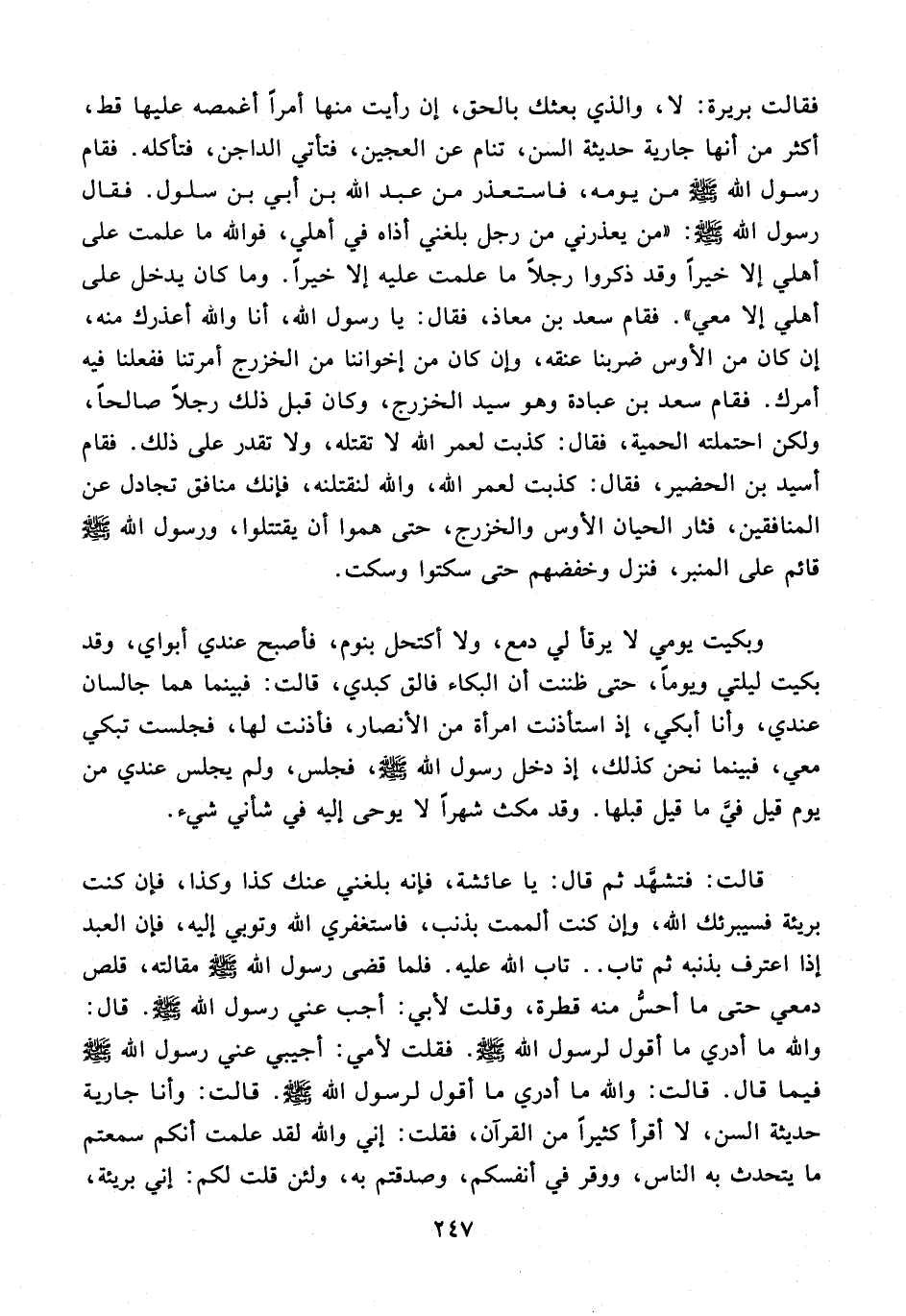 فقالت بريرة: لا، والذي بعثك بالحق، إن رأيت منها أمرًا أغمصه عليها قط، أكثر من أنها جارية حديثة السن، تنام عن العجين، فتأتي الداجن، فتأكله. فقام رسول الله - صلى الله عليه وسلم - من يومه، فاستعذر من عبد الله بن أبي بن سلول. فقال رسول الله - صلى الله عليه وسلم -: "من يعذرني من رجل بلغني أذاه في أهلي، فوالله ما علمت على أهلي إلا خيرًا وقد ذكروا رجلًا ما علمت عليه إلا خيرًا. وما كان يدخل على أهلي إلا معي". فقام سعد بن معاذ، فقال: يا رسول الله، أنا والله أعذرك منه، إن كان من الأوس ضربنا عنقه، وإن كان من إخواننا من الخزرج أمرتنا ففعلنا فيه أمرك. فقام سعد بن عبادة وهو سيد الخزرج، وكان قبل ذلك رجلًا صالحًا، ولكن احتملته الحمية، فقال: كذبت لعمر الله لا تقتله، ولا تقدر على ذلك. فقام أسيد بن الحضير، فقال: كذبت لعمر الله، والله لنقتلنه، فإنك منافق تجادل عن المنافقين، فثار الحيان الأوس والخزرج، حتى هموا أن يقتتلوا، ورسول الله - صلى الله عليه وسلم - قائم على المنبر، فنزل وخفضهم حتى سكتوا وسكت.
