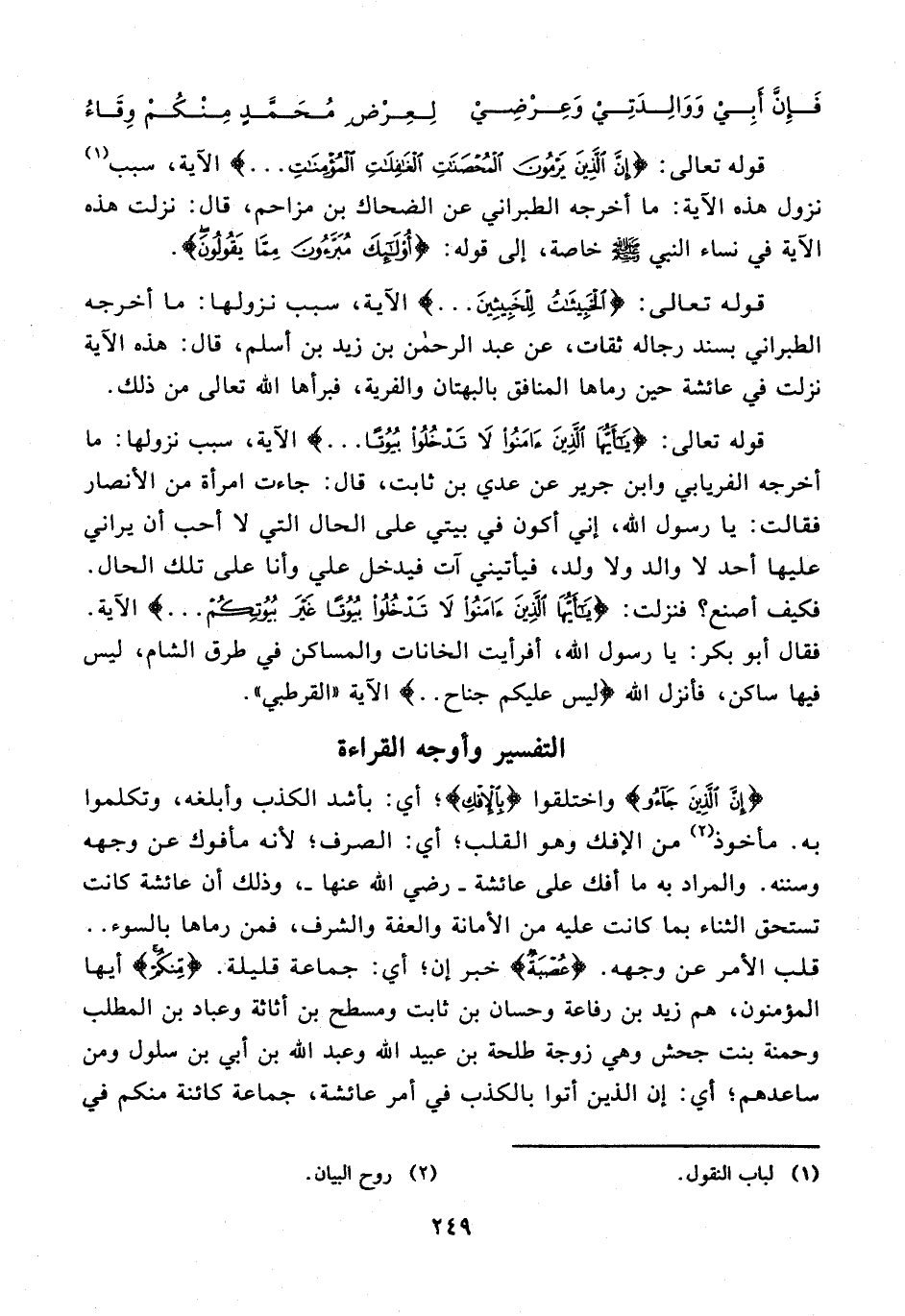 قوله تعالى: {إِنَّ الَّذِينَ يَرْمُونَ الْمُحْصَنَاتِ الْغَافِلَاتِ الْمُؤْمِنَاتِ ...} الآية، سبب (¬1) نزول هذه الآية: ما أخرجه الطبراني عن الضحاك بن مزاحم، قال: نزلت هذه الآية في نساء النبي - صلى الله عليه وسلم - خاصة، إلى قوله: {أُولَئِكَ مُبَرَّءُونَ مِمَّا يَقُولُونَ}.