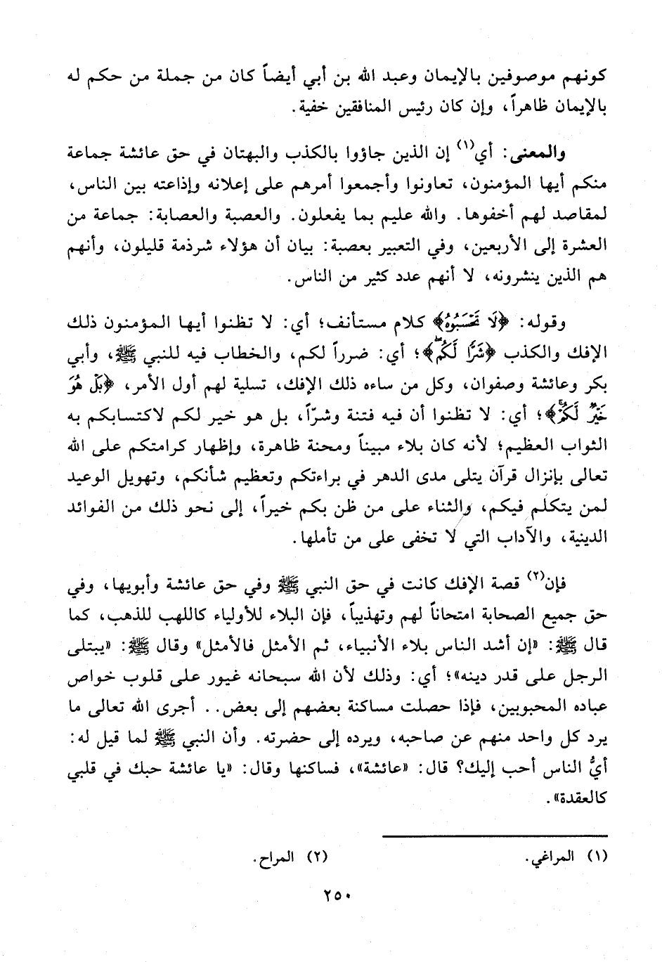 والمعنى: أي (¬1) إن الذين جاؤوا بالكذب والبهتان في حق عائشة جماعة منكم أيها المؤمنون، تعاونوا وأجمعوا أمرهم على إعلانه وإذاعته بين الناس، لمقاصد لهم أخفوها. والله عليم بما يفعلون. والعصبة والعصابة: جماعة من العشرة إلى الأربعين، وفي التعبير بعصبة: بيان أن هؤلاء شرذمة قليلون، وأنهم هم الذين ينشرونه، لا أنهم عدد كثير من الناس.