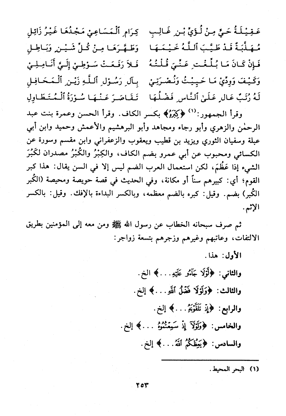 وقرأ الجمهور: (¬1) {كِبْرَهُ} بكسر الكاف. وقرأ الحسن وعمرة بنت عبد الرحمن والزهري وأبو رجاء ومجاهد وأبو البرهشيم والأعمش وحميد وابن أبي عبلة وسفيان الثوري ويزيد بن قطيب ويعقوب والزعفراني وابن مقسم وسورة عن الكسائي ومحبوب عن أبي عمرو بضم الكاف، والكِبْرُ والكُبْرُ مصدران لكَبُرَ الشيء إذا عَظُمَ، لكن استعمال العرب الضم ليس إلا في السن يقال: هذا كبر القوم؛ أي: كبيرهم سنًا أو مكانة، وفي الحديث في قصة حويصة ومحيصة (الكُبر الكُبر) بضم. وقيل: كبره بالضم معظمه، وبالكسر البداءة بالإفك. وقيل: بالكسر الإثم.