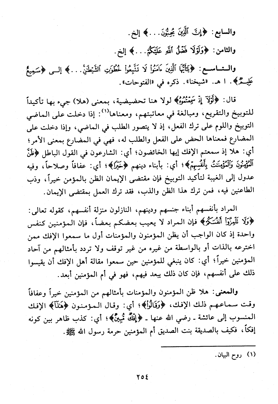 12 - قال: {لَوْلَا إِذْ سَمِعْتُمُوهُ} لولا هنا تحضيضية، بمعنى (هلا) جيء بها تأكيدًا للتوبيخ والتقريع، ومبالغة في معاتبتهم، ومعناها (¬1): إذا دخلت على الماضي التوبيخ واللوم على ترك الفعل، إذ لا يتصور الطلب في الماضي، وإذا دخلت على المضارع فمعناها الحض على الفعل والطلب له، فهي في المضارع بمعنى الأمر؛ أي: هلا إذ سمعتم الإفك إيها الخائضون؛ أي: الشارعون في القول الباطل {ظَنَّ الْمُؤْمِنُونَ وَالْمُؤْمِنَاتُ بِأَنْفُسِهِمْ}؛ أي: بأبناء دينهم {خَيْرًا}؛ أي: عفافًا وصلاحًا، وفيه عدول إلى الغيبة لتأكيد التوبيخ فإن مقتضى الإيمان الظن بالمؤمن خيرًا، وذب الطاعنين فيه، فمن ترك هذا الظن والذب، فقد ترك العمل بمقتضى الإيمان.