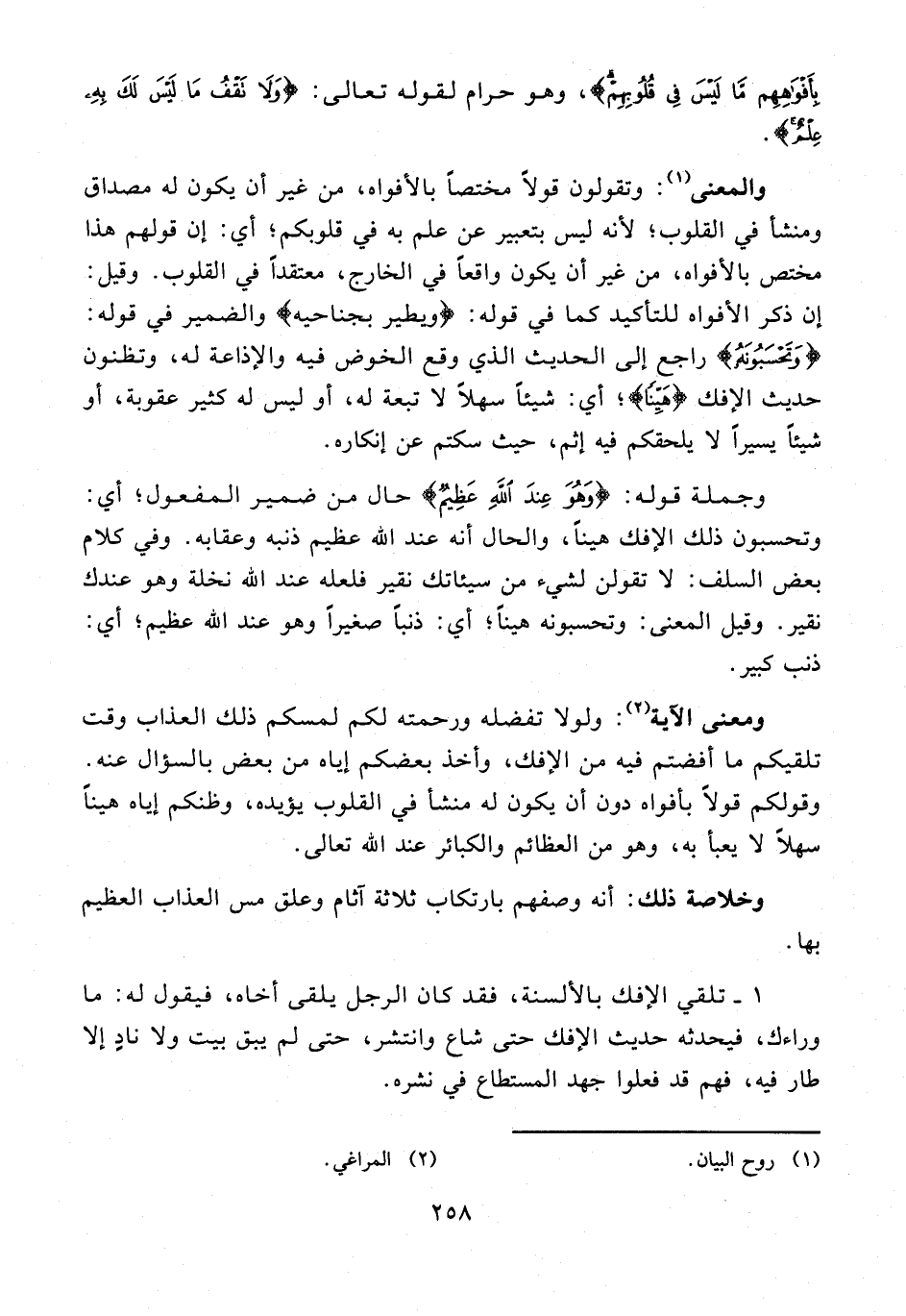 ومعنى الآية (¬2): ولولا تفضله ورحمته لكم لمسكم ذلك العذاب وقت تلقيكم ما أفضتم فيه من الإفك، وأخذ بعضكم إياه من بعض بالسؤال عنه. وقولكم قولًا بأفواه دون أن يكون له منشأ في القلوب يؤيده، وظنكم إياه هينًا سهلًا لا يعبأ به، وهو من العظائم والكبائر عند الله تعالى.