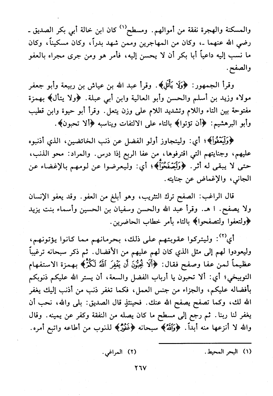 قال الراغب: الصفح ترك التثريب، وهو أبلغ من العفو. وقد يعفو الإنسان ولا يصفح. اهـ. وقرأ عبد الله والحسن وسفيان بن الحسين وأسماء بنت يزيد {ولتعفوا ولتصفحوا} بالتاء بأمر خطاب الحاضرين.