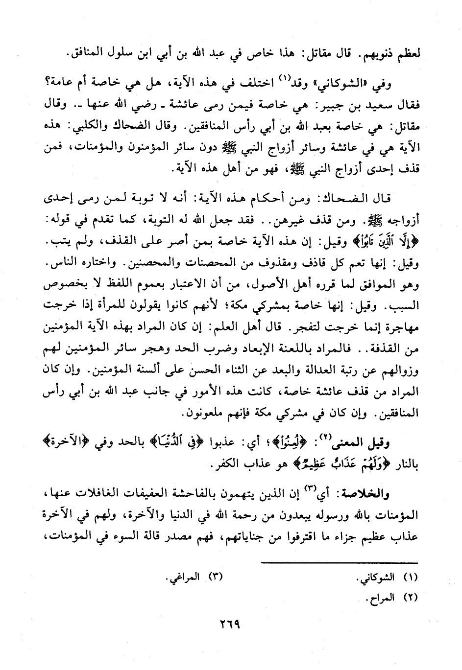 وفي "الشواكاني" وقد (¬1) اختلف في هذه الآية، هل هي خاصة أم عامة؟ فقال سعيد بن جبير: هي خاصة فيمن رمى عائشة - رضي الله عنها -. وقال مقاتل: هي خاصة بعبد الله بن أبي رأس المنافقين. وقال الضحاك والكلبي: هذه الآية هي في عائشة وسائر أزواج النبي - صلى الله عليه وسلم - دون سائر المؤمنون والمؤمنات، فمن قذف إحدى أزواج النبي - صلى الله عليه وسلم -، فهو من أهل هذه الآية.