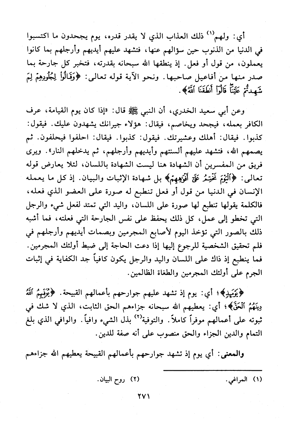 وعن أبي سعيد الخدري، أن النبي - صلى الله عليه وسلم - قال: "إذا كان يوم القيامة، عرف الكافر بعمله، فيجحد ويخاصم، فيقال: هؤلاء جيرانك يشهدون عليك. فيقول: كذبوا. فيقال: أهلك وعشيرتك. فيقول: كذبوا. فيقال: احلفوا فيحلفون. ثم يصمهم الله، فتشهد عليهم ألسنتهم وأيديهم وأرجلهم، ثم يدخلهم النار". ويرى فريق من المفسرين أن الشهادة هنا ليست الشهادة باللسان، لئلا يعارض قوله تعالى: {الْيَوْمَ نَخْتِمُ عَلَى أَفْوَاهِهِمْ} بل شهادة الإثبات والبيان. إذ كل ما يعمله الإنسان في الدنيا من قول أو فعل تنطبع له صورة على العضو الذي فعله، فالكلمة يقولها تنطبع لها صورة على اللسان، واليد التي تمتد لفعل شيء والرجل التي تخطو إلى عمل، كل ذلك يحفظ على نفس الجارحة التي فعلته، فما أشبه ذلك بالصور التي تؤخذ اليوم لأصابع المجرمين وبصمات أيديهم وأرجلهم في فلم تحقيق الشخصية للرجوع إليها إذا دعت الحاجة إلى ضبط أولئك المجرمين. فما ينطبع إذ ذاك على اللسان واليد والرجل يكون كافيًا جد الكفاية في إثبات الجرم على أولئك المجرمين والطغاة الظالمين.