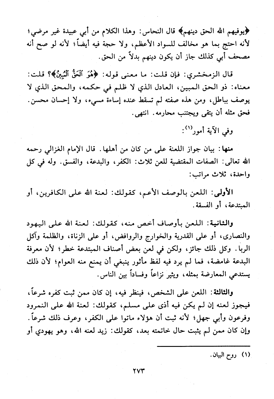 منها: بيان جواز اللعنة على من كان من أهلها. قال الإِمام الغزالي رحمه الله تعالى: الصفات المقتضية للعن ثلاث: الكفر، والبدعة، والفسق. وله في كل واحدة، ثلاث مراتب: