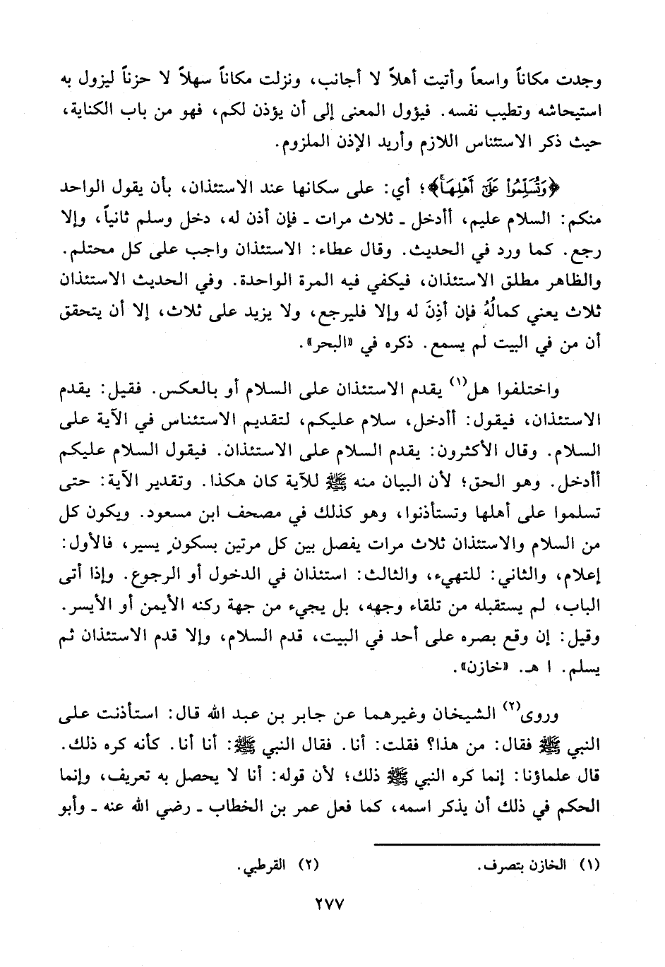 واختلفوا هل (¬1) يقدم الاستئذان على السلام أو بالعكس. فقيل: يقدم الاستئذان، فيقول: أأدخل، سلام عليكم، لتقديم الاستئناس في الآية على السلام. وقال الأكثرون: يقدم السلام على الاستئذان. فيقول السلام عليكم أأدخل. وهو الحق؛ لأن البيان منه - صلى الله عليه وسلم - للآية كان هكذا. وتقدير الآية: حتى تسلموا على أهلها وتستأذنوا، وهو كذلك في مصحف ابن مسعود. ويكون كل من السلام والاستئذان ثلاث مرات يفصل بين كل مرتين بسكونٍ يسير، فالأول: إعلام، والثاني: للتهيء، والثالث: استئذان في الدخول أو الرجوع. وإذا أتى الباب، لم يستقبله من تلقاء وجهه، بل يجيء من جهة ركنه الأيمن أو الأيسر. وقيل: إن وقع بصره على أحد في البيت، قدم السلام، وإلا قدم الاستئذان ثم يسلم. اهـ. "خازن".
