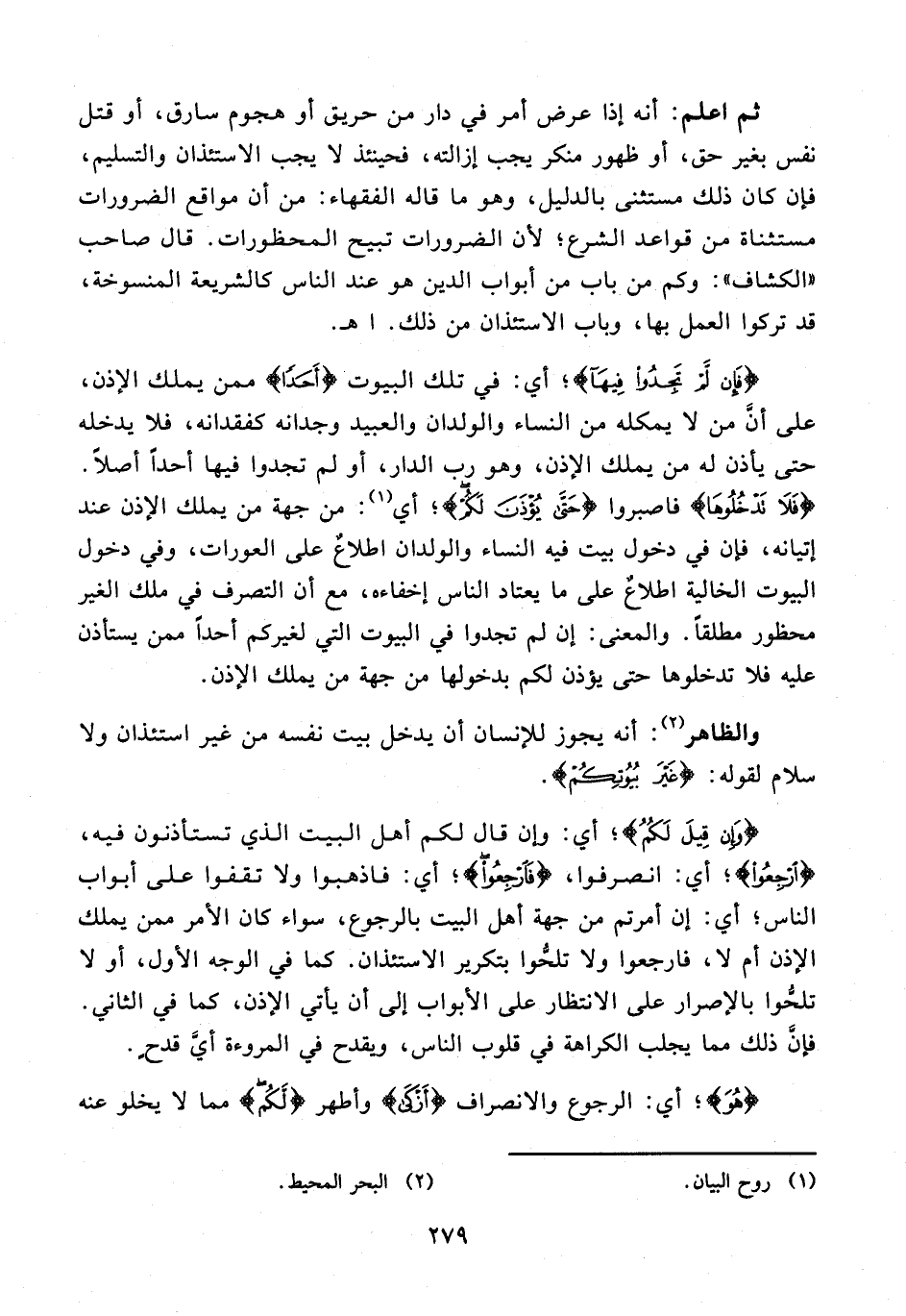 ثم اعلم: أنه إذا عرض أمر في دار من حريق أو هجوم سارق، أو قتل نفس بغير حق، أو ظهور منكر يجب إزالته، فحينئذ لا يجب الاستئذان والتسليم، فإن كان ذلك مستثنى بالدليل، وهو ما قاله الفقهاء: من أن مواقع الضرورات مستثناة من قواعد الشرع؛ لأن الضرورات تبيح المحظورات. قال صاحب "الكشاف": وكم من باب من أبواب الدين هو عند الناس كالشريعة المنسوخة، قد تركوا العمل بها، وباب الاستئذان من ذلك. اهـ.
