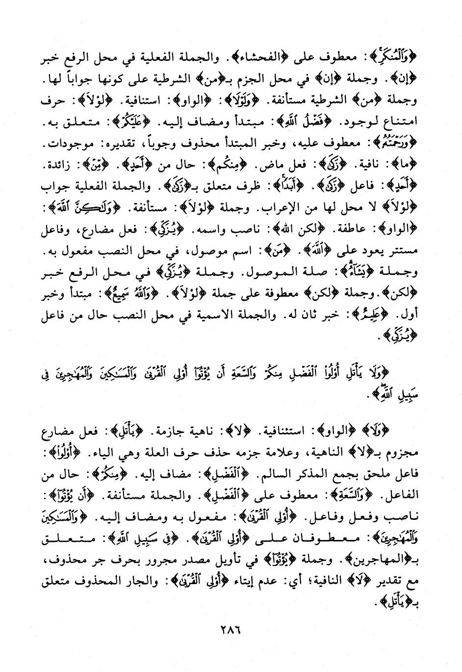 {وَلَا} {الواو}: استئنافية. {لا}: ناهية جازمة. {يَأْتَلِ}: فعل مضارع مجزوم بـ {لا} الناهية، وعلامة جزمه حذف حرف العلة وهي الياء. {أُولُو}: فاعل ملحق بجمع المذكر السالم. {الْفَضْلِ}: مضاف إليه. {مِنْكُمْ}: حال من الفاعل. {وَالسَّعَةِ}: معطوف على {الْفَضْلِ}. والجملة مستأنفة. {أَنْ يُؤْتُوا}: ناصب وفعل وفاعل. {أُولِي الْقُرْبَى}: مفعول به ومضاف إليه. {وَالْمَسَاكِينَ وَالْمُهَاجِرِينَ}: معطوفان على {أُولِي الْقُرْبَى}. {فِي سَبِيلِ اللَّهِ}: متعلق بـ {المهاجرين}. وجملة {يُؤْتُوا} في تأويل مصدر مجرور بحرف جر محذوف، مع تقدير {لَا} النافية؛ أي: عدم إيتاء {أُولِي الْقُرْبَى}: والجار المحذوف متعلق بـ {يَأْتَلِ}.