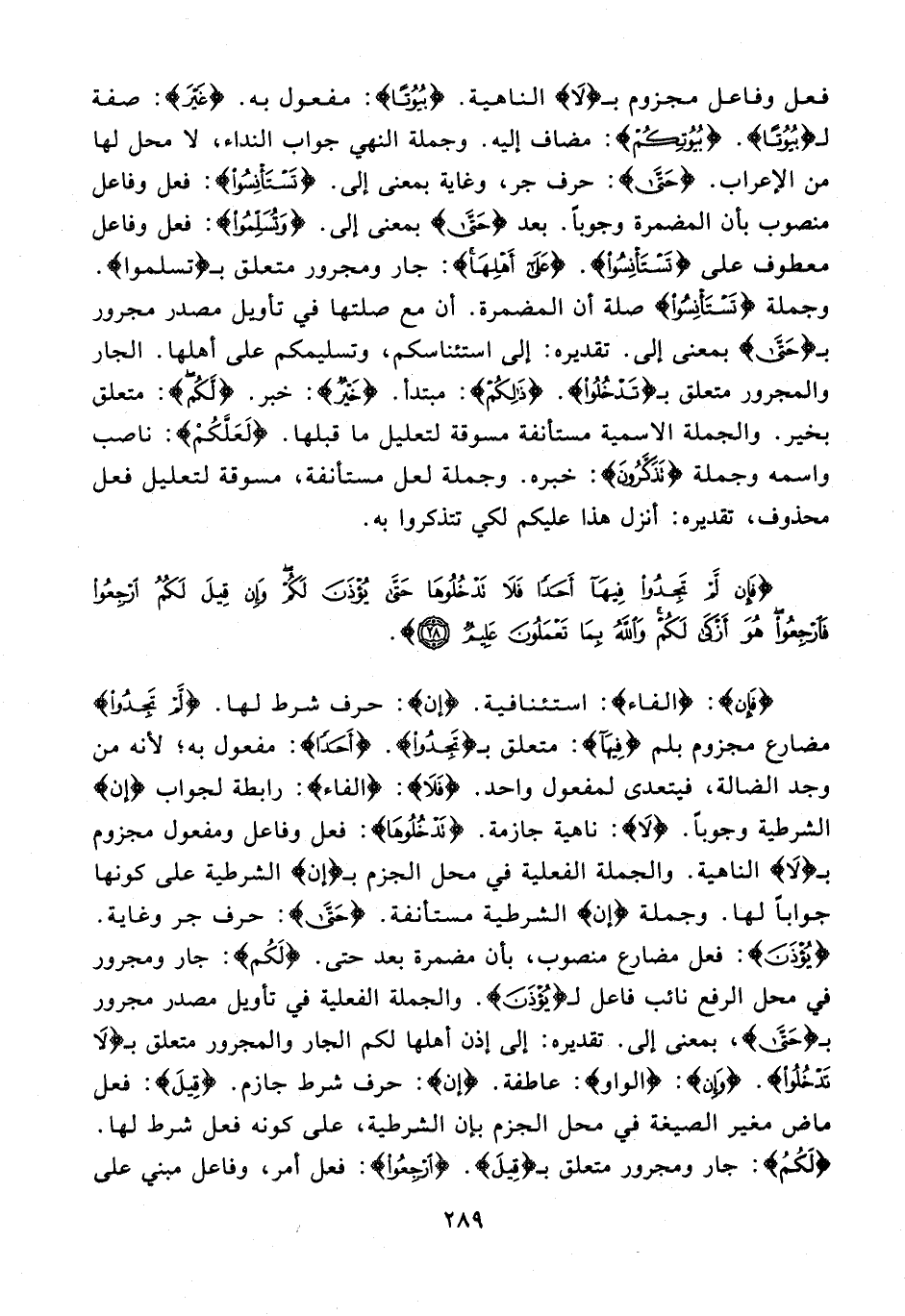 {فَإِنْ}: {الفاء}: استئنافية. {إن}: حرف شرط لها. {لَمْ تَجِدُوا} مضارع مجزوم بلم {فِيهَا}: متعلق بـ {تَجِدُوا}. {أَحَدًا}: مفعول به؛ لأنه من وجد الضالة، فيتعدى لمفعول واحد. {فَلَا}: {الفاء}: رابطة لجواب {إن} الشرطية وجوبًا. {لَا}: ناهية جازمة. {تَدْخُلُوهَا}: فعل وفاعل ومفعول مجزوم بـ {لَا} الناهية. والجملة الفعلية في محل الجزم بـ {إن} الشرطية على كونها جوابًا لها. وجملة {إن} الشرطية مستأنفة. {حَتَّى}: حرف جر وغاية. {يُؤْذَنَ}: فعل مضارع منصوب، بأن مضمرة بعد حتى. {لَكُمْ}: جار ومجرور في محل الرفع نائب فاعل لـ {يُؤْذَنَ}. والجملة الفعلية في تأويل مصدر مجرور بـ {حَتَّى}، بمعنى إلى. تقديره: إلى إذن أهلها لكم الجار والمجرور متعلق بـ {لَا تَدْخُلُوهَا}. {وَإِنْ}: {الواو}: عاطفة. {إن}: حرف شرط جازم. {قِيلَ}: فعل ماض مغير الصيغة في محل الجزم بإن الشرطية، على كونه فعل شرط لها. {لَكُمُ}: جار ومجرور متعلق بـ {قِيلَ}. {ارْجِعُوا}: فعل أمر، وفاعل مبني على