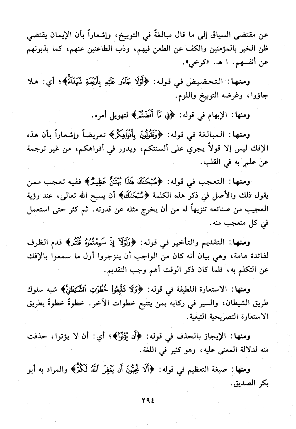ومنها: التقديم والتأخير في قوله: {وَلَوْلَا إِذْ سَمِعْتُمُوهُ قُلْتُمْ} قدم الظرف لفائدة هامة، وهي بيان أنه كان من الواجب أن ينزجروا أول ما سمعوا بالإفك عن التكلم به، فلما كان ذكر الوقت أهم وجب التقديم.