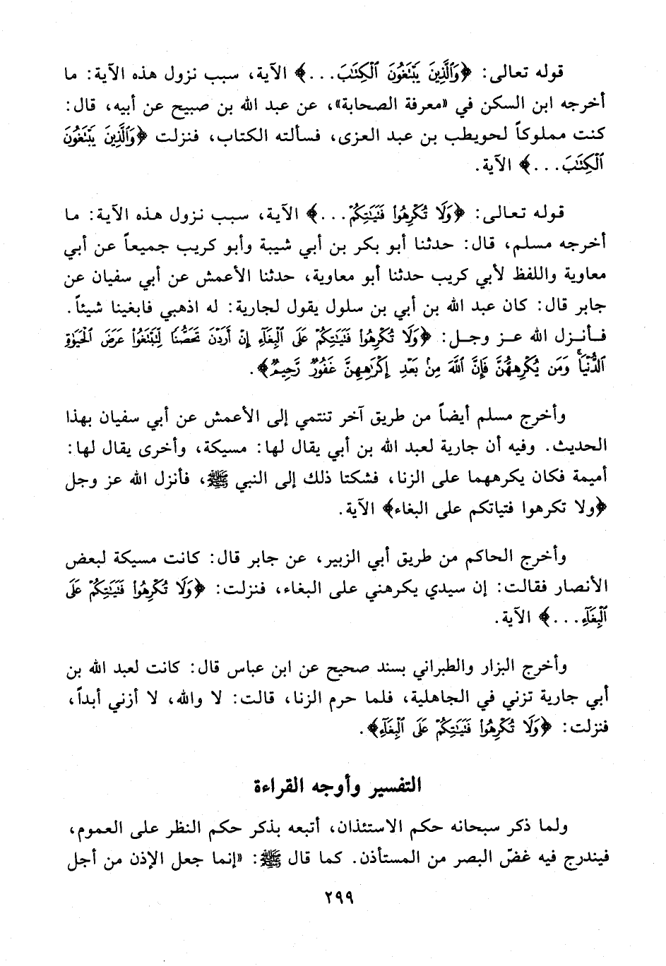 قوله تعالى: {وَلَا تُكْرِهُوا فَتَيَاتِكُمْ ...} الآية، سبب نزول هذه الآية: ما أخرجه مسلم، قال: حدثنا أبو بكر بن أبي شيبة وأبو كريب جميعًا عن أبي معاوية واللفظ لأبي كريب حدثنا أبو معاوية، حدثنا الأعمش عن أبي سفيان عن جابر قال: كان عبد الله بن أبي بن سلول يقول لجارية: له اذهبي فابغينا شيئًا. فأنزل الله عز وجل: {وَلَا تُكْرِهُوا فَتَيَاتِكُمْ عَلَى الْبِغَاءِ إِنْ أَرَدْنَ تَحَصُّنًا لِتَبْتَغُوا عَرَضَ الْحَيَاةِ الدُّنْيَا وَمَنْ يُكْرِهْهُنَّ فَإِنَّ اللَّهَ مِنْ بَعْدِ إِكْرَاهِهِنَّ غَفُورٌ رَحِيمٌ}.