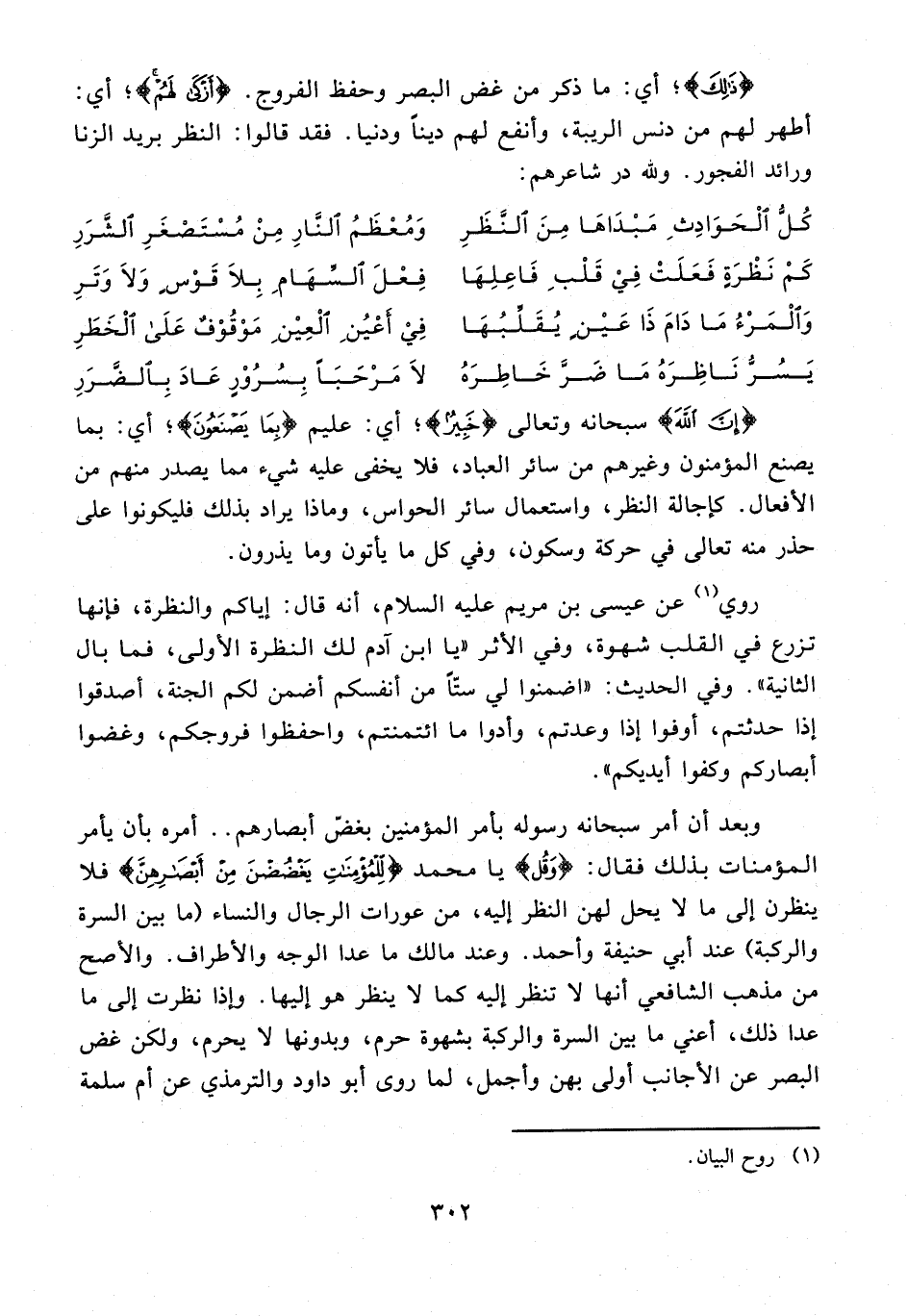 31 - وبعد أن أمر سبحانه رسوله بأمر المؤمنين بغضّ أبصارهم .. أمره بأن يأمر المؤمنات بذلك فقال: {وَقُلْ} يا محمد {لِلْمُؤْمِنَاتِ يَغْضُضْنَ مِنْ أَبْصَارِهِنَّ} فلا ينظرن إلى ما لا يحل لهن النظر إليه، من عورات الرجال والنساء (ما بين السرة والركبة) عند أبي حنيفة وأحمد. وعند مالك ما عدا الوجه والأطراف. والأصح من مذهب الشافعي أنها لا تنظر إليه كما لا ينظر هو إليها. وإذا نظرت إلى ما عدا ذلك، أعني ما بين السرة والركبة بشهوة حرم، وبدونها لا يحرم، ولكن غض البصر عن الأجانب أولى بهن وأجمل، لما روى أبو داود والترمذي عن أم سلمة