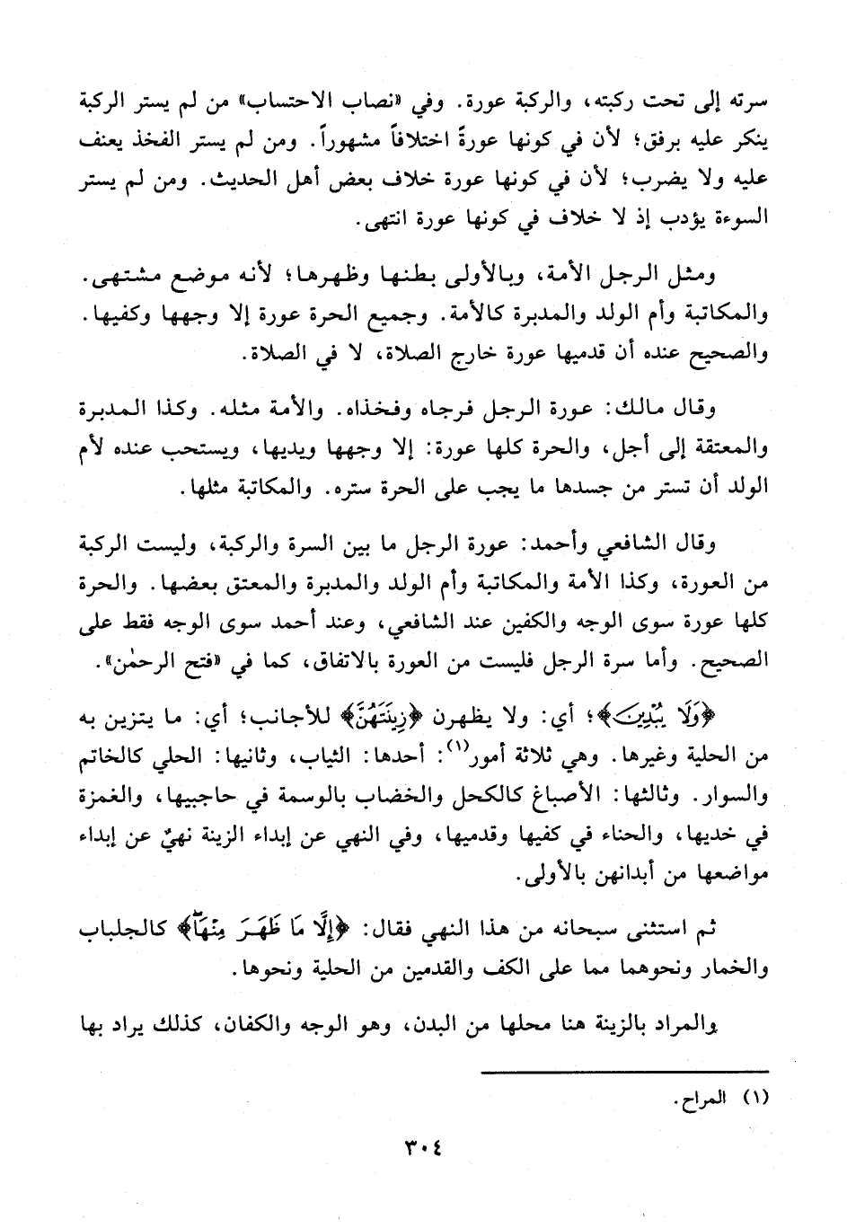 وقال الشافعي وأحمد: عورة الرجل ما بين السرة والركبة، وليست الركبة من العورة، وكذا الأمة والمكاتبة وأم الولد والمدبرة والمعتق بعضها. والحرة كلها عورة سوى الوجه والكفين عند الشافعي، وعند أحمد سوى الوجه فقط على الصحيح. وأما سرة الرجل فليست من العورة بالاتفاق، كما في "فتح الرحمن".