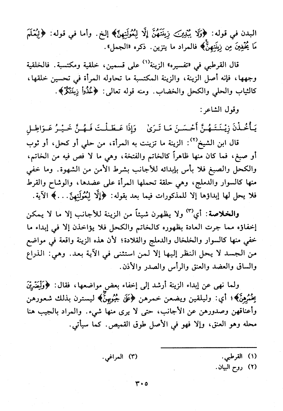 قال ابن الشيخ (¬2): الزينة ما تزينت به المرأة، من حلي أو كحل، أو ثوب أو صبغ، فما كان منها ظاهرًا كالخاتم والفتخة، وهي ما لا فص فيه من الخاتم، والكحل والصبغ فلا بأس بإبدائه للأجانب بشرط الأمن من الشهوة. وما خفي منها كالسوار والدملج، وهي حلقة تحملها المرأة على عضدها، والوشاح والقرط فلا يحل لها إبداؤها إلا للمذكورات فيما بعد بقوله: {إِلَّا لِبُعُولَتِهِنَّ} ... الآية.