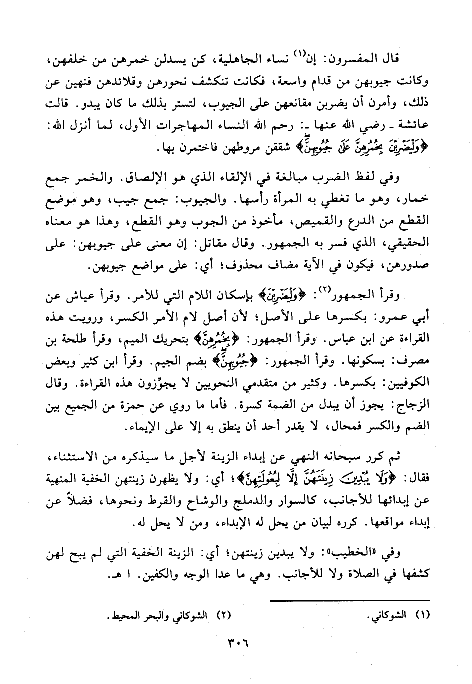 وقرأ الجمهور (¬2): {وَلْيَضْرِبْنَ} بإسكان اللام التي للأمر. وقرأ عياش عن أبي عمرو: بكسرها على الأصل؛ لأن أصل لام الأمر الكسر، ورويت هذه القراءة عن ابن عباس. وقرأ الجمهور: {بِخُمُرِهِنَّ} بتحريك الميم، وقرأ طلحة بن مصرف: بسكونها. وقرأ الجمهور: {جُيُوبِهِنَّ} بضم الجيم. وقرأ ابن كثير وبعض الكوفيين: بكسرها. وكثير من متقدمي النحويين لا يجوَّزون هذه القراءة. وقال الزجاج: يجوز أن يبدل من الضمة كسرة. فأما ما روي عن حمزة من الجميع بين الضم والكسر فمحال، لا يقدر أحد أن ينطق به إلا على الإيماء.