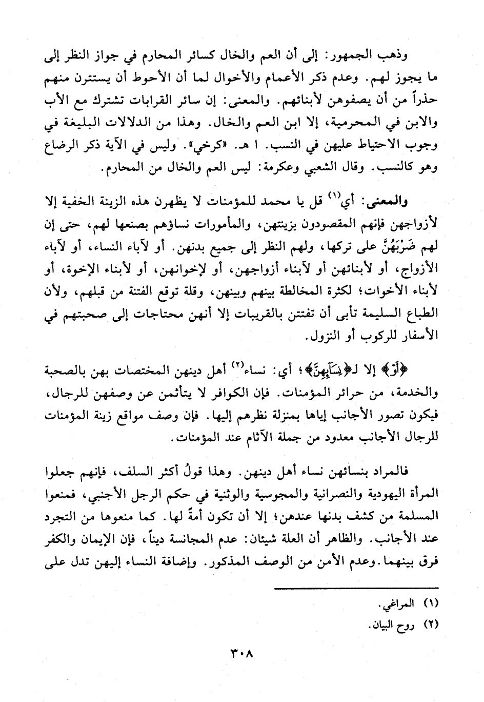 والمعنى: أي (¬1) قل يا محمد للمؤمنات لا يظهرن هذه الزينة الخفية إلا لأزواجهن فإنهم المقصودون بزينتهن، والمأمورات نساؤهم بصنعها لهم، حتى إن لهم ضَرْبَهُنَّ على تركها, ولهم النظر إلى جميع بدنهن. أو لآباء النساء، أو لآباء الأزواج، أو لأبنائهن أو لأبناء أزواجهن، أو لإخوانهن، أو لأبناء الإخوة، أو لأبناء الأخوات؛ لكثرة المخالطة بينهم وبينهن، وقلة توقع الفتنة من قبلهم، ولأن الطباع السليمة تأبى أن تفتتن بالقريبات إلا أنهن محتاجات إلى صحبتهم في الأصفار للركوب أو النزول.