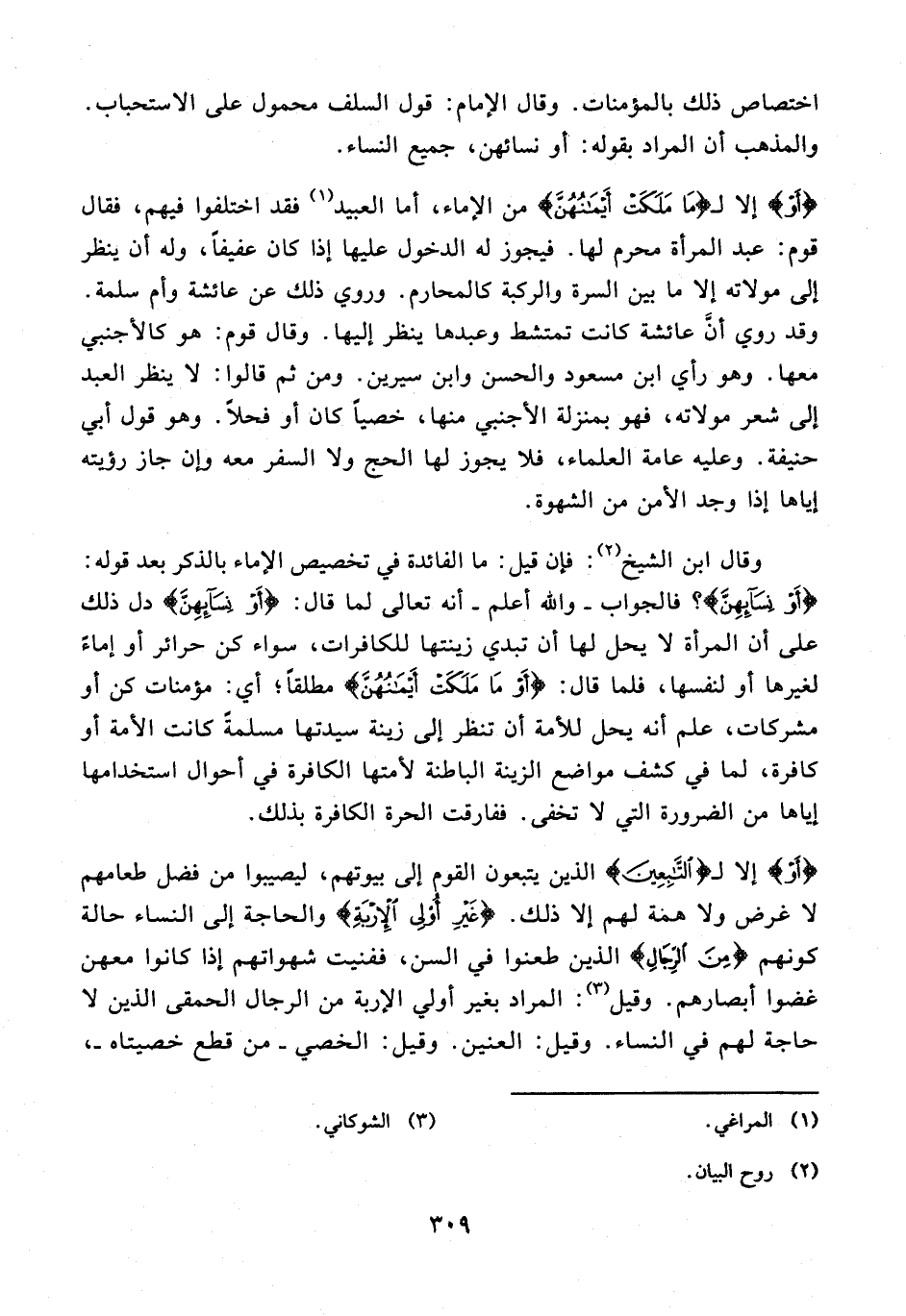 اختصاص ذلك بالمؤمنات. وقال الإِمام: قول السلف محمول على الاستحباب. والمذهب أن امراد بقوله: أو نسائهن، جميع النساء.