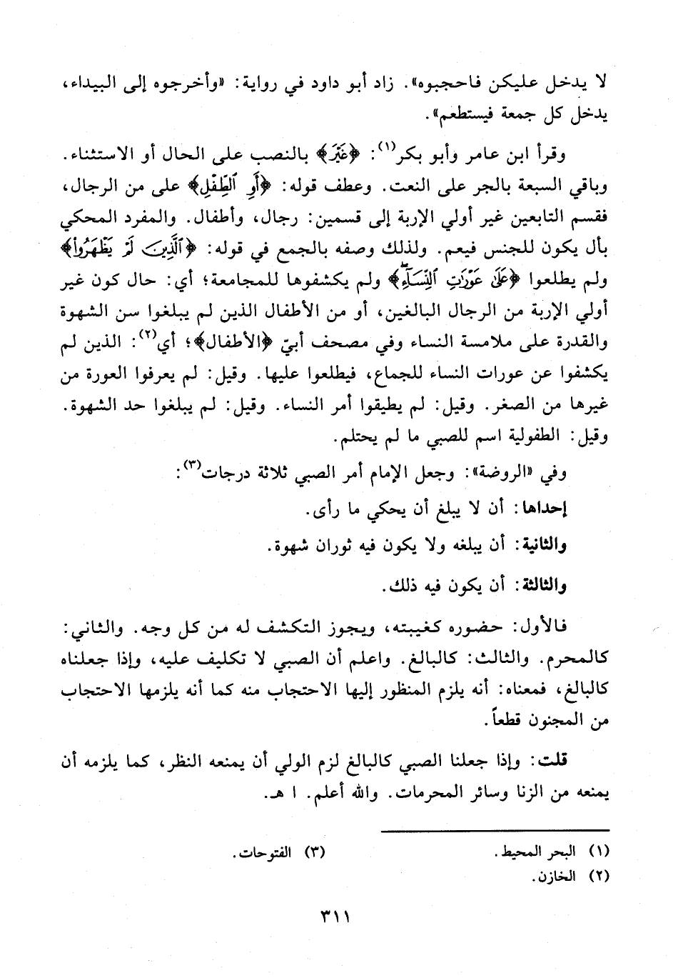 فالأول: حضوره كغيبته، ويجوز التكشف له من كل وجه. والثاني: كالمحرم. والثالث: كالبالغ. واعلم أن الصبي لا تكليف عليه، وإذا جعلناه كالبالغ، فمعناه: أنه يلزم المنظور إليها الاحتجاب منه كما أنه يلزمها الاحتجاب من المجنون قطعًا.