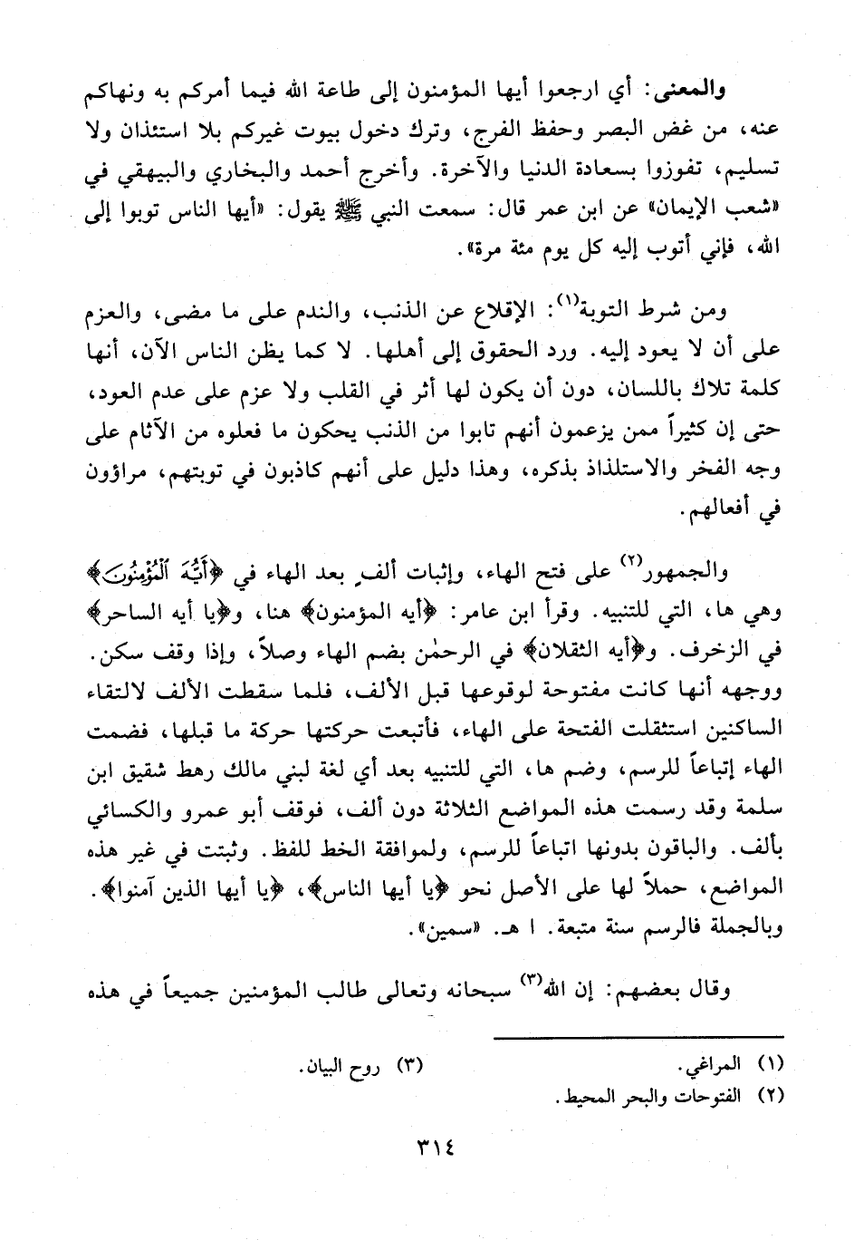 والمعنى: أي ارجعوا أيها المؤمنون إلى طاعة الله فيما أمركم به ونهاكم عنه، من غض البصر وحفظ الفرج، وترك دخول بيوت غيركم بلا استئذان ولا تسليم، تفوزوا بسعادة الدنيا والآخرة. وأخرج أحمد والبخاري والبيهقي في "شعب الإيمان" عن ابن عمر قال: سمعت النبي - صلى الله عليه وسلم - يقول: "أيها الناس توبوا إلى الله، فإني أتوب إليه كل يوم مئة مرة".