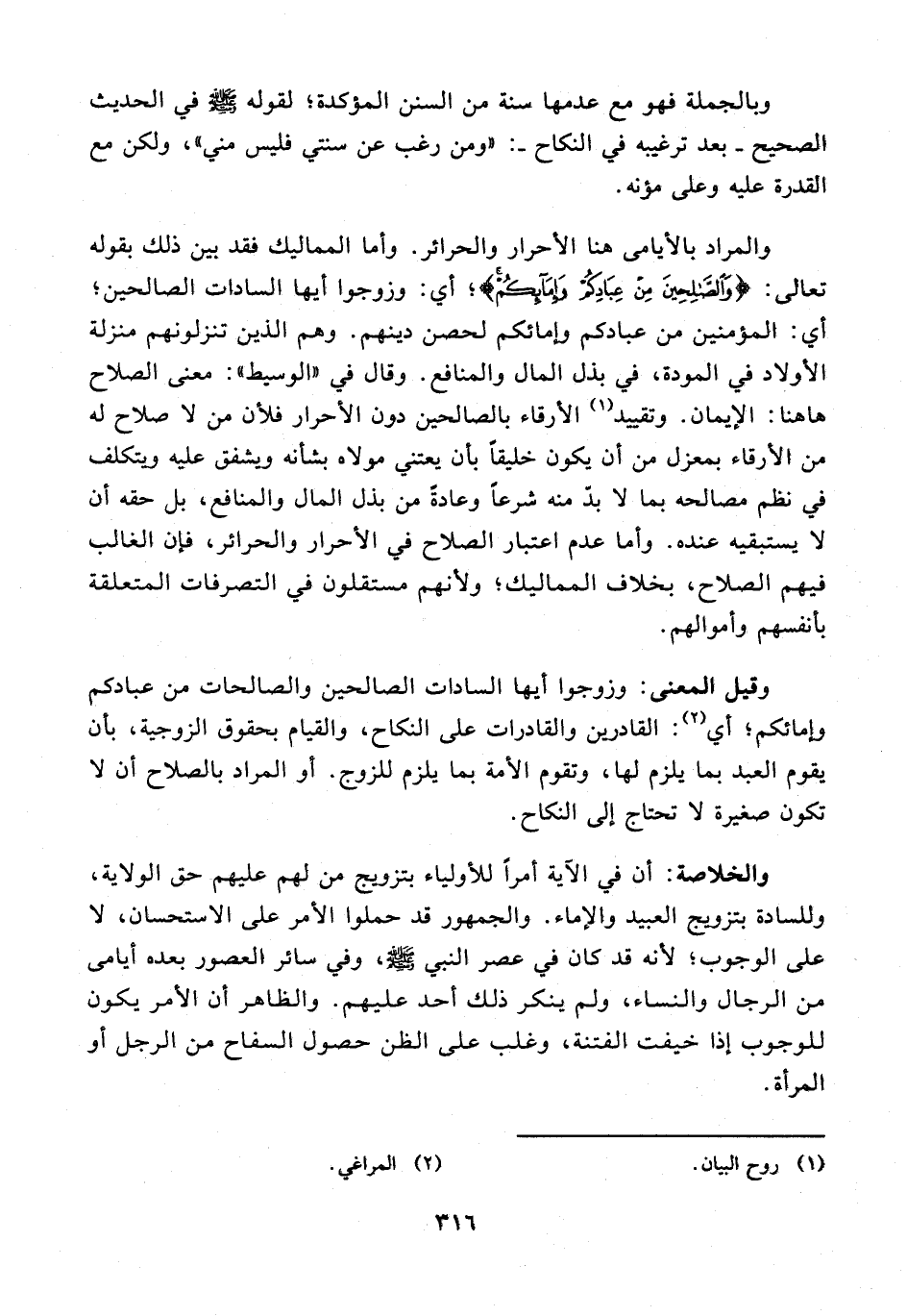 والمراد بالأيامى هنا الأحرار والحرائر. وأما المماليك فقد بين ذلك بقوله تعالى: {وَالصَّالِحِينَ مِنْ عِبَادِكُمْ وَإِمَائِكُمْ}؛ أي: وزوجوا أيها السادات الصالحين؛ أي: المؤمنين من عبادكم وإمائكم لحصن دينهم. وهم الذين تنزلونهم منزلة الأولاد في المودة، في بذل المال والمنافع. وقال في "الوسيط": معنى الصلاح هاهنا: الإيمان. وتقييد (¬1) الأرقاء بالصالحين دون الأحرار فلأن من لا صلاح له من الأرقاء بمعزل من أن يكون خليقًا بأن يعتني مولاه بشأنه ويشفق عليه ويتكلف في نظم مصالحه بما لا بدّ منه شرعًا وعادةَ من بذل المال والمنافع، بل حقه أن لا يستبقيه عنده. وأما عدم اعتبار الصلاح في الأحرار والحرائر، فإن الغالب فيهم الصلاح، بخلاف المماليك؛ ولأنهم مستقلون في التصرفات المتعلقة بأنفسهم وأموالهم.