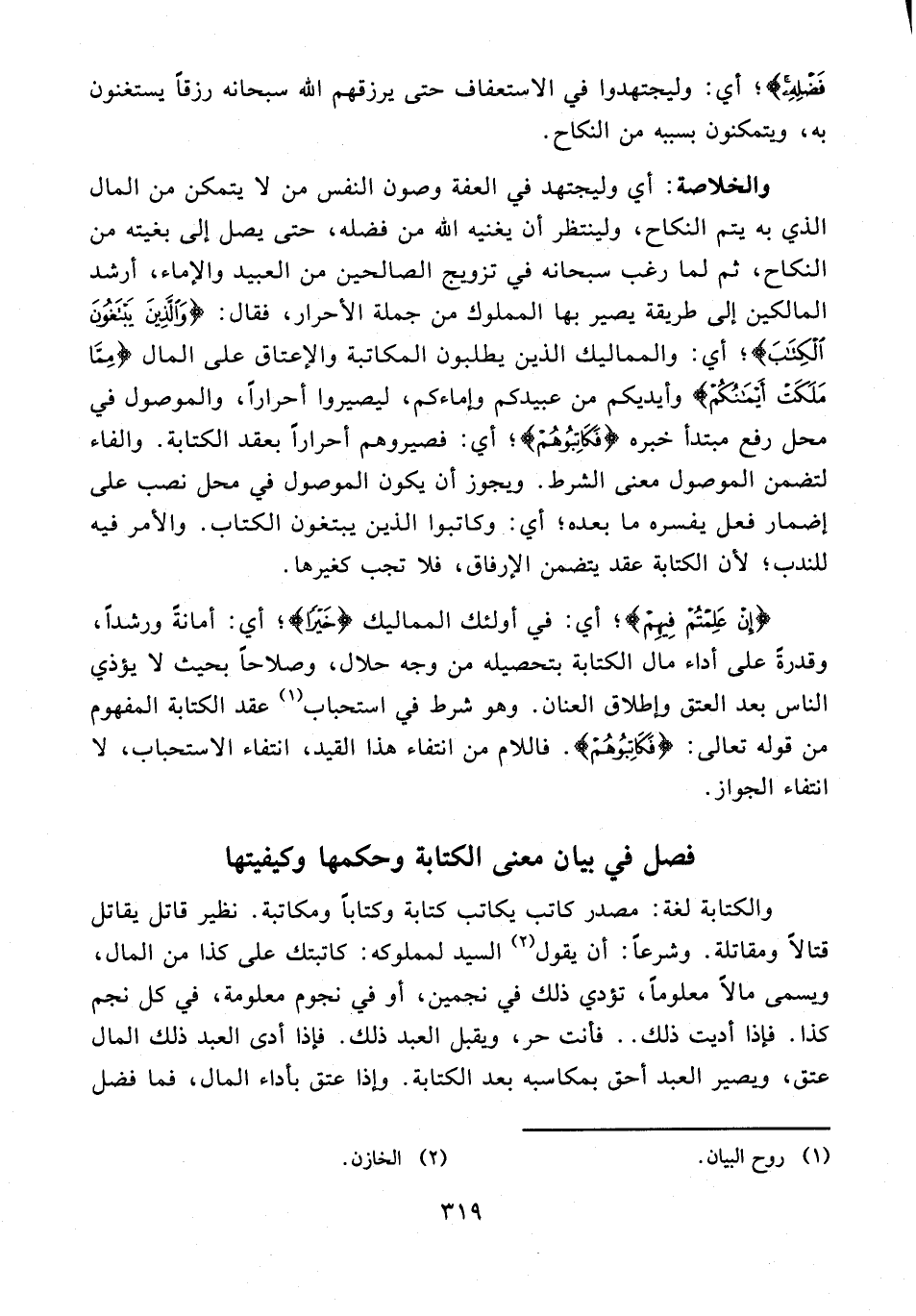 والخلاصة: أي وليجتهد في العفة وصون النفس من لا يتمكن من المال الذي به يتم النكاح، ولينتظر أن يغنيه الله من فضله، حتى يصل إلى بغيته من النكاح، ثم لما رغب سبحانه في تزويج الصالحين من العبيد والإماء، أرشد المالكين إلى طريقة يصير بها المملوك من جملة الأحرار، فقال: {وَالَّذِينَ يَبْتَغُونَ الْكِتَابَ}؛ أي: والمماليك الذين يطلبون المكاتبة والإعتاق على المال {مِمَّا مَلَكَتْ أَيْمَانُكُمْ} وأيديكم من عبيدكم وإماءكم، ليصيروا أحرارًا، والموصول في محل رفع مبتدأ خبره {فَكَاتِبُوهُمْ}؛ أي: فصيروهم أحرارًا بعقد الكتابة. والفاء لتضمن الموصول معنى الشرط. ويجوز أن يكون الموصول في محل نصب على إضمار فعل يفسره ما بعده؛ أي: وكاتبوا الذين يبتغون الكتاب. والأمر فيه للندب؛ لأن الكتابة عقد يتضمن الإرفاق، فلا تجب كغيرها.