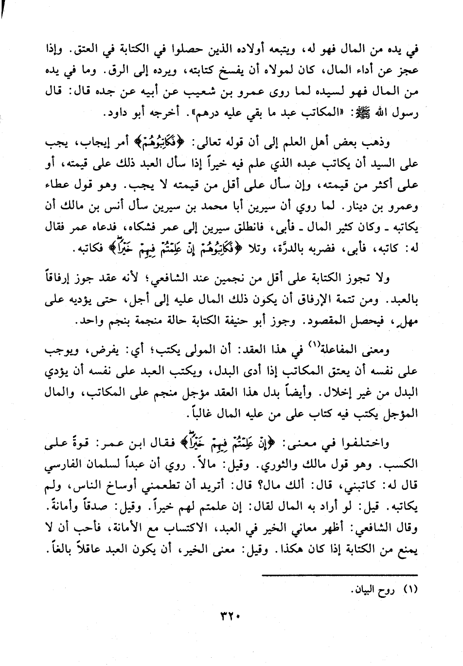 وذهب بعض أهل العلم إلى أن قوله تعالى: {فَكَاتِبُوهُمْ} أمر إيجاب، يجب على السيد أن يكاتب عبده الذي علم فيه خيرًا إذا سأل العبد ذلك على قيمته، أو على أكثر من قيمته، وإن سأل على أقل من قيمته لا يجب. وهو قول عطاء وعمرو بن دينار. لما روي أن سيرين أبا محمد بن سيرين سأل أنس بن مالك أن يكاتبه - وكان كثير المال - فأبى، فانطلق سيرين إلى عمر فشكاه، فدعاه عمر فقال له: كاتبه، فأبى، فضربه بالدرَّة، وتلا {فَكَاتِبُوهُمْ إِنْ عَلِمْتُمْ فِيهِمْ خَيْرًا} فكاتبه.