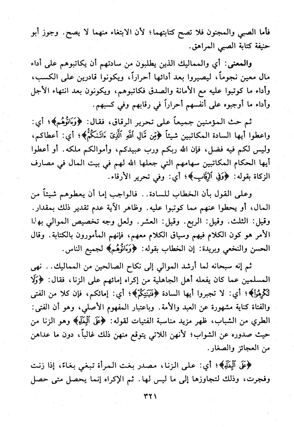 والمعنى: أي والمماليك الذين يطلبون من سادتهم أن يكاتبوهم على أداء مال معين نجومًا، ليصيروا بعد أدائها أحرارًا، ويكونوا قادرين على الكسب، وأداء ما كوتبوا عليه مع الأمانة والصدق فكاتبوهم، ويكونون بعد إنتهاء الأجل وأداء ما أوجبوه على أنفسهم أحرارًا في رقابهم وفي كسبهم.