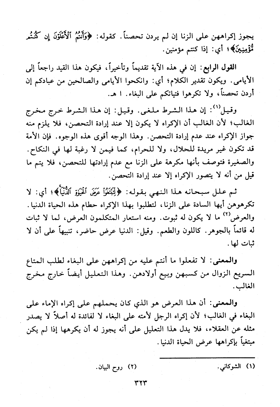 القول الرابع: إن في هذه الآية تقديمًا وتأخيرًا، فيكون هذا القيد راجعًا إلى الأيامى. ويكون تقدير الكلام؛ أي: وانكحوا الأيامى والصالحين من عبادكم إن أردن تحصنًا، ولا تكرهوا فتياتكم على البغاء. اهـ.