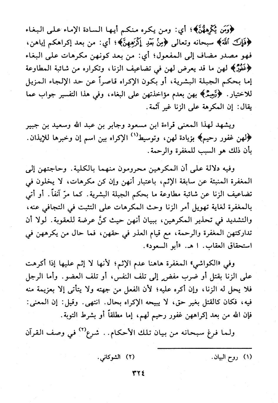 وفيه دلالة على أن المكرهين محرومون منهما بالكلية. وحاجتهن إلى المغفرة المنبئة عن سابقة الإثم، باعتبار أنهن وإن كن مكرهات، لا يخلون في تضاعيف الزنا عن شائبة مطاوعة ما بحكم الجبلة البشرية. كما مرّ آنفًا. أو أتي بالمغفرة لغاية تهويل أمر الزنا وحث المكرهات على التثبت في التجافي عنه، والتشديد في تحذير المكرهين، ببيان أنهن حيث كنَّ عرضة للعقوبة. لولا أن تداركتهن المغفرة والرحمة، مع قيام العذر في حقهن، فما حال من يكرههن في استحقاق العقاب. اهـ. "أبو السعود".