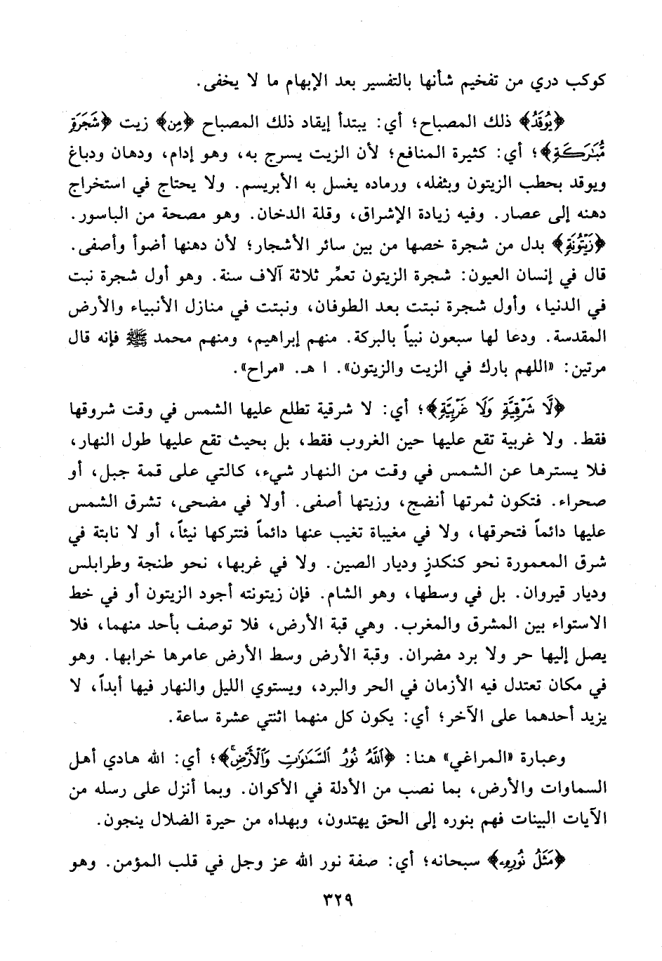 {لَا شَرْقِيَّةٍ وَلَا غَرْبِيَّةٍ}؛ أي: لا شرقية تطلع عليها الشمس في وقت شروقها فقط. ولا غربية تقع عليها حين الغروب فقط، بل بحيث تقع عليها طول النهار، فلا يسترها عن الشمس في وقت من النهار شيء، كالتي على قمة جبل، أو صحراء. فتكون ثمرتها أنضج، وزيتها أصفى. أولا في مضحى، تشرق الشمس عليها دائمًا فتحرقها, ولا في مغيباة تغيب عنها دائمًا فتتركها نيئًا، أو لا نابتة في شرق المعمورة نحو كنكدزٍ وديار الصين. ولا في غربها، نحو طنجة وطرابلس وديار قيروان. بل في وسطها، وهو الشام. فإن زيتونته أجود الزيتون أو في خط الاستواء بين المشرق والمغرب. وهي قبة الأرض، فلا توصف بأحد منهما، فلا يصل إليها حر ولا برد مضران. وقبة الأرض وسط الأرض عامرها خرابها. وهو في مكان تعتدل فيه الأزمان في الحر والبرد، ويستوي الليل والنهار فيها أبدًا، لا يزيد أحدهما على الآخر؛ أي: يكون كل منهما اثنتي عشرة ساعة.
