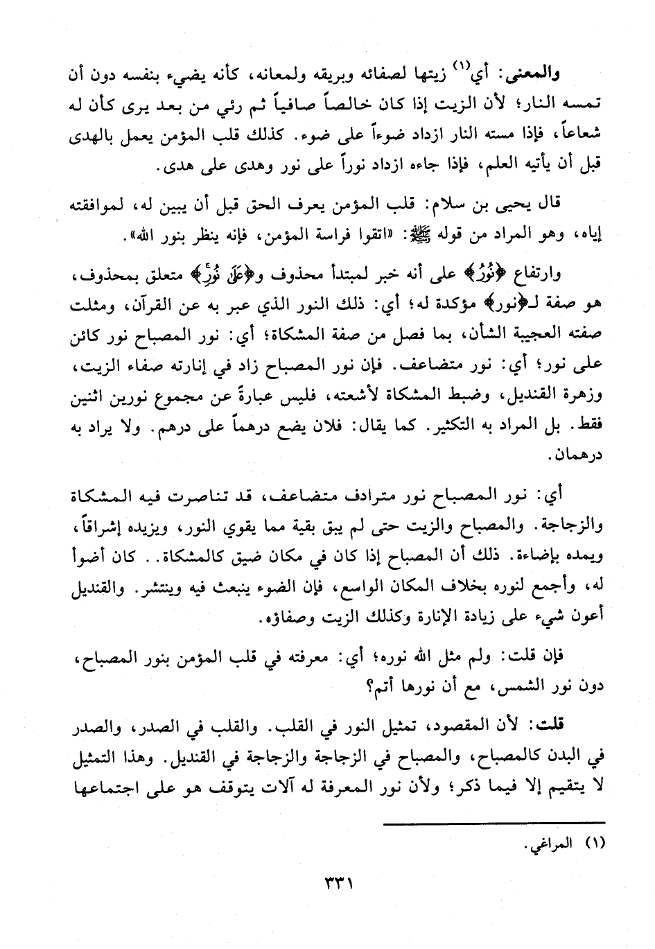 أي: نور المصباح نوره مترادف متضاعف، قد تناصرت فيه المشكاة والزجاجة. والمصباح والزيت حتى لم يبق بقية مما يقوي النور، ويزيده إشراقًا، ويمده بإضاءة. ذلك أن المصباح إذا كان في مكان ضيق كالمشكاة .. كان أضوأ له، وأجمع لنوره بخلاف المكان الواسع، فإن الضوء ينبعث فيه وينتشر. والقنديل أعون شيء على زيادة الإنارة وكذلك الزيت وصفاؤه.