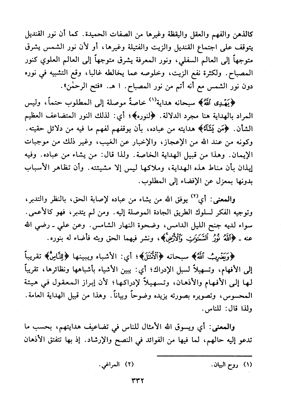والمعنى: أي (¬2) يوفق الله من يشاء من عباده لإصابة الحق، بالنظر والتدبر، وتوجيه الفكر لسلوك الطريق العبادة الموصلة إليه. ومن لم يتدبر، فهو كالأعمى. سواء لديه جنح الليل الدامس، وضحوة النهار الشامس. وعن علي - رضي الله عنه - {اللَّهُ نُورُ السَّمَاوَاتِ وَالْأَرْضِ}، ونشر فيهما الحق وبثه فأضاء له بنوره.