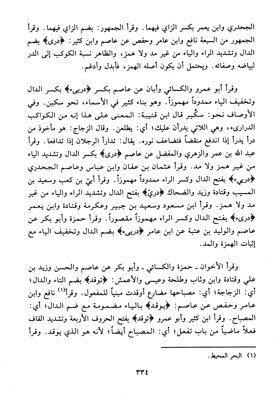 وقرأ الأخوان - حمزة والكسائي - وأبو بكر عن عاصم والحسن وزيد بن علي وقتادة وابن وثاب وطلحة وعيسى والأعمش: {توقد} بضم التاء والدال؛ أي: الزجاجة؛ أي: مصباحها مضارع أوقدت مبنيًا للمفعول. وقرأ (¬1) نافع وابن عامر وحفص عن عاصم: {يوقد} بالياء مضمومة مع ضم الدال؛ أي: المصباح. وقرأ ابن كثير وأبو عمرو {توقد} بفتح الحروف الأربعة وتشديد القاف فعلًا ماضيًا من باب تفعل؛ أي: المصباح أيضًا؛ لأنه هو الذي يوقد. وقرأ