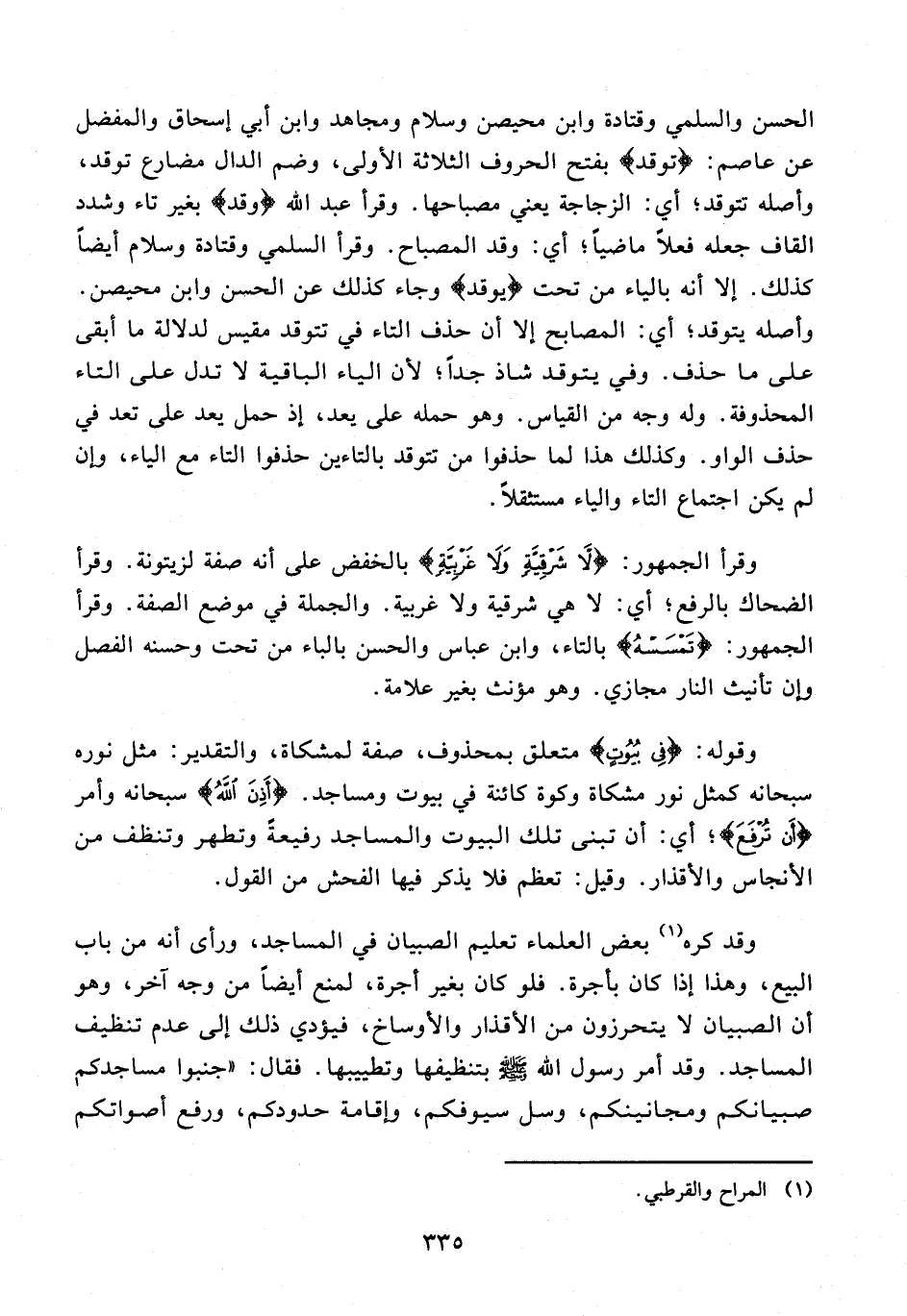 وقرأ الجمهور: {لَا شَرْقِيَّةٍ وَلَا غَرْبِيَّةٍ} بالخفض على أنه صفة لزيتونة. وقرأ الضحاك بالرفع؛ أي: لا هي شرقية ولا غربية. والجملة في موضع الصفة. وقرأ الجمهور: {تَمْسَسْهُ} بالتاء، وابن عباس والحسن بالباء من تحت وحسنه الفصل وإن تأنيث النار مجازي. وهو مؤنث بغير علامة.