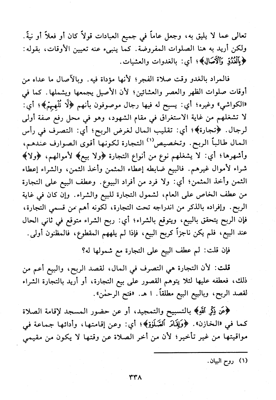 37 - أي: يسبح له فيها رجال موصوفون بأنهم {لَا تُلْهِيهِمْ}؛ أي: لا تشغلهم من غاية الاستغراق في مقام الشهود، وهو في محل رفع صفة أولى لرجال. {تِجَارَةٌ}؛ أي: تقليب المال لغرض الربح؛ أي: التصرف في رأس المال طالبًا الربح. وتخصيص (¬1) التجارة لكونها أقوى الصوارف عندهم، وأشهرها؛ أي: لا يشغلهم نوع من أنواع التجارة {وَلَا بَيْعٌ} لأموالهم، {ولا} شراء لأموال غيرهم. فالبيع ضابطه إعطاء المثمن وأخذ الثمن، والشراء إعطاء الثمن وأخذ المثمن؛ أي: ولا فرد من أفراد البيوع. وعطف البيع على التجارة من عطف الخاص على العام، لشمول التجارة للبيع والشراء. وإن كان في غاية الربح. وإفراده بالذكر من اندراجه تحت التجارة، لكونه أهم من قسمي التجارة، فإن الربح يتحقق بالبيع، ويتوقع بالشراء؛ أي: ربح الشراء متوقع في ثاني الحال عند البيع، فلم يكن ناجزًا كربح البيع، فإذا لم يلههم المقطوع، فالمظنون أولى.