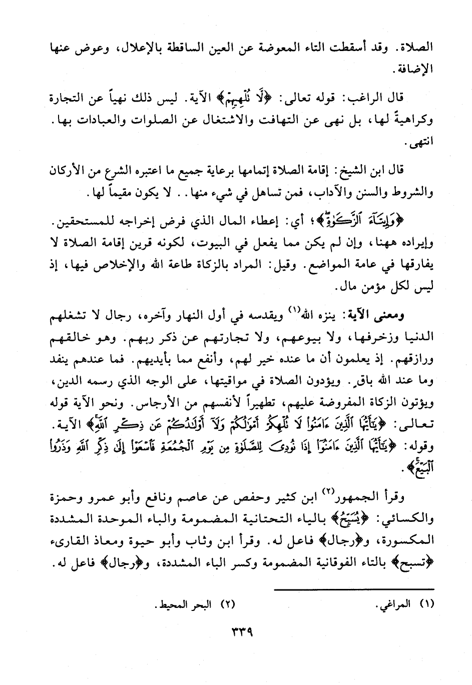 ومعنى الآية: ينزه الله (¬1) ويقدسه في أول النهار وآخره، رجال لا تشغلهم الدنيا وزخرفها , ولابيوعهم، ولا تجارتهم عن ذكر ربهم. وهو خالقهم ورازقهم. إذ يعلمون أن ما عنده خير لهم، وأنفع مما بأيديهم. فما عندهم ينفد وما عند الله باقٍ. ويؤدون الصلاة في مواقيتها، على الوجه الذي رسمه الدين، ويؤتون الزكاة المفروضة عليهم، تطهيرًا لأنفسهم من الأرجاس. ونحو الآية قوله تعالى: {يَا أَيُّهَا الَّذِينَ آمَنُوا لَا تُلْهِكُمْ أَمْوَالُكُمْ وَلَا أَوْلَادُكُمْ عَنْ ذِكْرِ اللَّهِ} الآية. وقوله: {يَا أَيُّهَا الَّذِينَ آمَنُوا إِذَا نُودِيَ لِلصَّلَاةِ مِنْ يَوْمِ الْجُمُعَةِ فَاسْعَوْا إِلَى ذِكْرِ اللَّهِ وَذَرُوا الْبَيْعَ}.