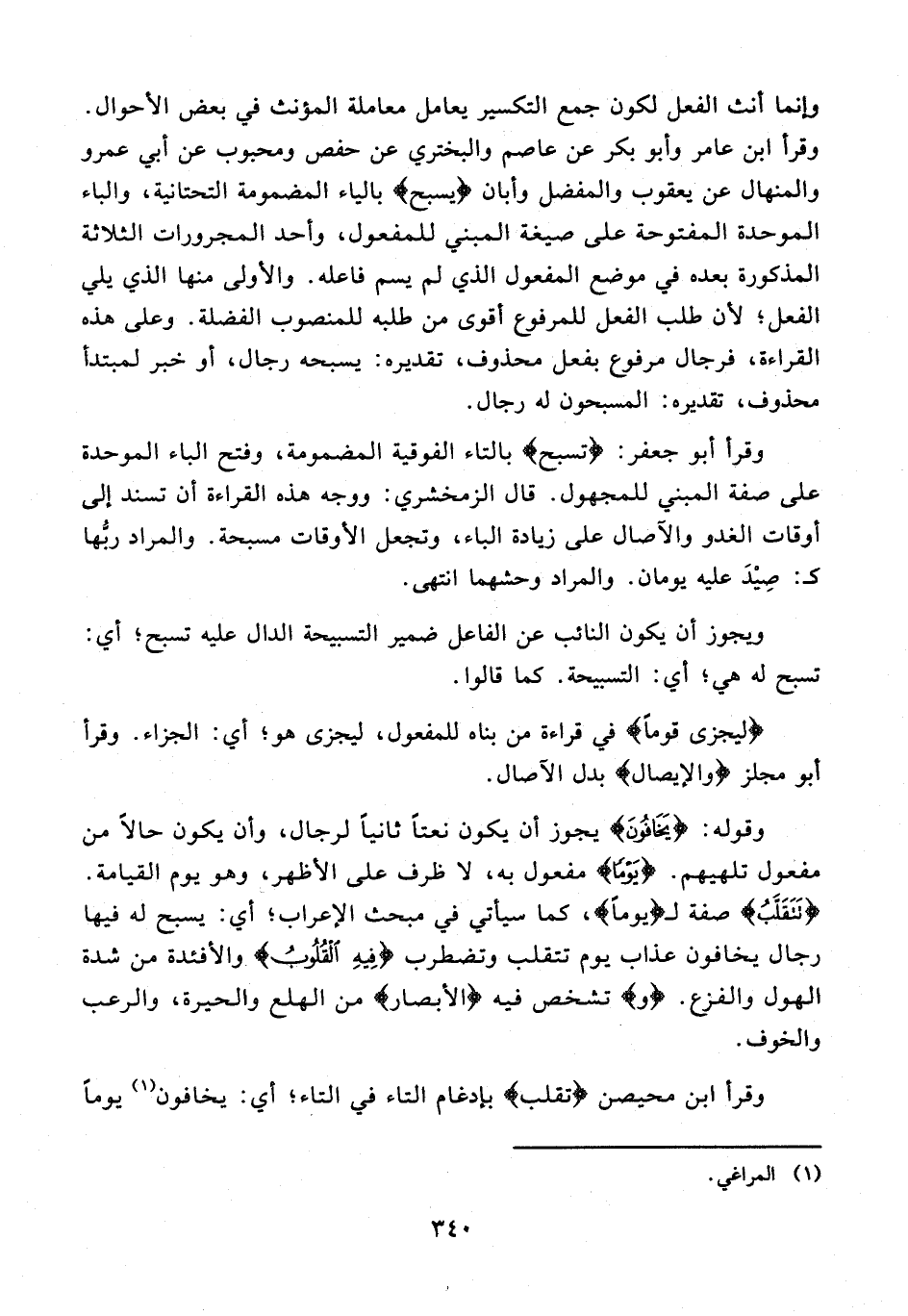 وقرأ أبو جعفر: {تسبح} بالتاء الفوقية المضمومة، وفتح الباء الموحدة على صفة المبني للمجهول. قال الزمخشري: ووجه هذه القراءة أن تسند إلى أوقات الغدو والآصال على زيادة الباء، وتجعل الأوقات مسبحة. والمراد ربُّها كـ: صِيْدَ عليه يومان. والمراد وحشهما انتهى.