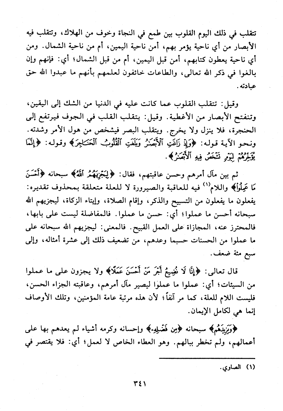 قال تعالى: {إِنَّا لَا نُضِيعُ أَجْرَ مَنْ أَحْسَنَ عَمَلًا} ولا يجزون على ما عملوا من السيئات؛ أي: عملوا ما عملوا ليصير مآل أمرهم، وعاقبته الجزاء الحسن، فليست اللام للعلة، كما مر آنفًا؛ لأن هذه مرتبة عامة المؤمنين، وتلك الأوصاف إنما هي لكامل الإيمان.