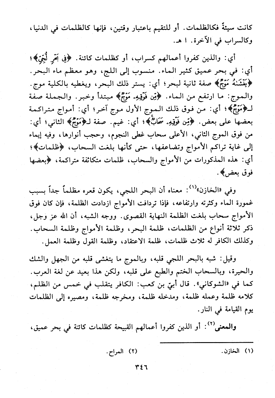 وفي "الخازن" (¬1): معناه أن البحر اللجي، يكون قعره مظلمًا جدًّا بسبب غمورة الماء وكثرته وارتفاعه، فإذا تردافت الأمواج ازدادت الظلمة، فإن كان فوق الأمواج سحاب بلغت الظلمة النهاية القصوى. ووجه الشبه، أن الله عز وجل، ذكر ثلاثة أنواع من الظلمات، ظلمة البحر، وظلمة الأمواج وظلمة السحاب. وكذلك الكافر له ثلاث ظلمات، ظلمة الاعتقاد، وظلمة القول وظلمة العمل.