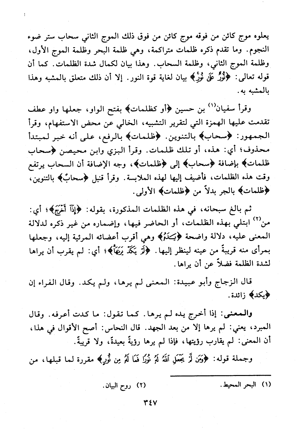 يعلوه موج كائن من فوقه موج كائن من فوق ذلك الموج الثاني سحاب ستر ضوء النجوم. وما تقدم ذكره ظلمات متراكمة، وهي ظلمة البحر وظلمة الموج الأول، وظلمة الموج الثاني، وظلمة السحاب. وهذا بيان لكمال شدة الظلمات. كما أن قوله تعالى: {نُورٌ عَلَى نُورٍ} بيان لغاية قوة النور. إلا أن ذلك متعلق بالمشبه وهذا بالمشبه به.