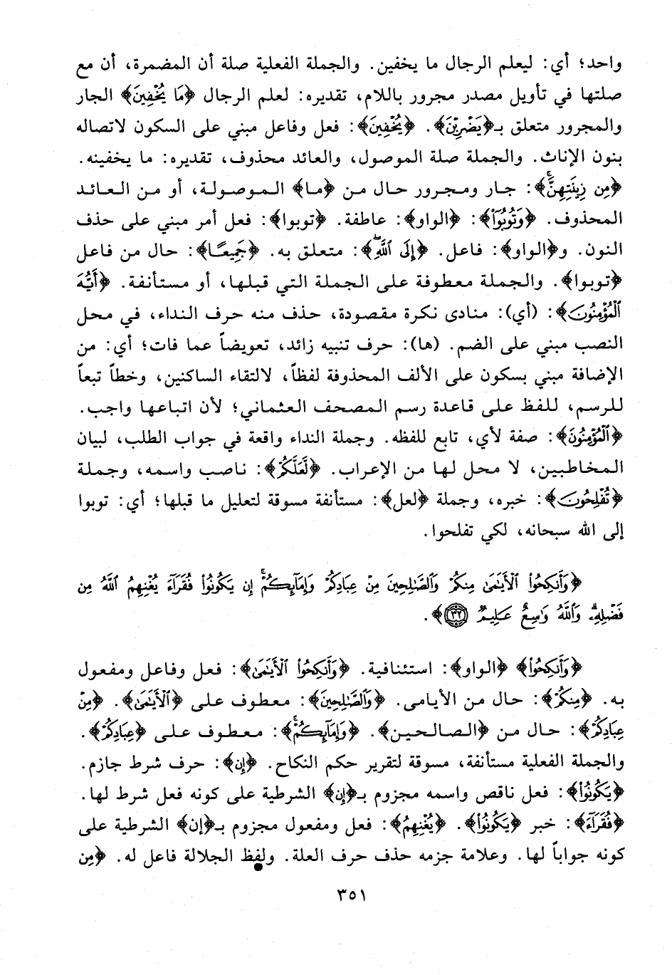 واحد؛ أي: ليعلم الرجال ما يخفين. والجملة الفعلية صلة أن المضمرة، أن مع صلتها في تأويل مصدر مجرور باللام، تقديره: لعلم الرجال {مَا يُخْفِينَ} الجار والمجرور متعلق بـ {يَضْرِبْنَ}. {يُخْفِين}: فعل وفاعل مبني على السكون لاتصاله بنون الإنالث. والجملة صلة الموصول، والعائد محذوف، تقديره: ما يخفينه. {مِنْ زِينَتِهِنَّ}: جار ومجرور حال من {ما} الموصولة، أو من العائد المحذوف. {وَتُوبُوا}: {الواو}: عاطفة. {توبوا}: فعل أمر مبني على حذف النون. و {الواو}: فاعل. {إِلَى اللَّهِ}: متعلق به. {جَمِيعًا}: حال من فاعل {توبوا}. والجملة معطوفة على الجملة التي قبلها، أو مستأنفة. {أَيُّهَ الْمُؤْمِنُون}: (أي): منادى نكرة مقصودة، حذف منه حرف النداء، في محل النصب مبني على الضم. (ها): حرف تنبيه زائد، تعويضًا عما فات؛ أي: من الإضافة مبني بسكون على الألف المحذوفة لفظًا، لالتقاء الساكنين، وخطًا تبعًا للرسم، للفظ على قاعدة رسم المصحف العثماني؛ لأن اتباعها واجب. {الْمُؤْمِنُونَ}: صفة لأي، تابع للفظه. وجملة النداء واقعة في جواب الطلب، لبيان المخاطبين، لا محل لها من الإعراب. {لَعَلَّكُمْ}: ناصب واسمه، وجملة {تُفْلِحُونَ}: خبره، وجملة {لعل}: مستأنفة مسوقة لتعليل ما قبلها؛ أي: توبوا إلى الله سبحانه، لكي تفلحوا.