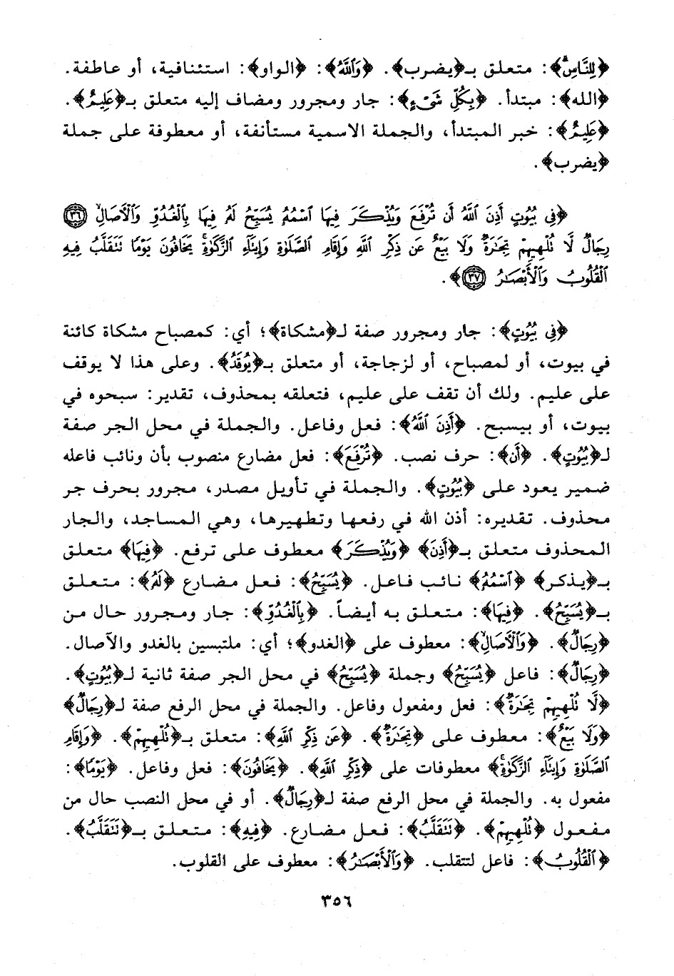 {فِي بُيُوتٍ}: جار ومجرور صفة لـ {مشكاة}؛ أي: كمصباح مشكاة كائنة في بيوت، أو لمصباح، أو لزجاجة، أو متعلق بـ {يُوقَدُ}. وعلى هذا لا يوقف على عليم. ولك أن تقف على عليم، فتعلقه بمحذوف، تقدير: سبحوه في بيوت، أو بيسبح. {أَذِنَ اللَّهُ}: فعل وفاعل. والجملة في محل الجر صفة لـ {بُيُوتٍ}. {أَنْ}: حرف نصب. {تُرْفَعَ}: فعل مضارع منصوب بأن ونائب فاعله ضمير يعود على {بُيُوتٍ}. والجملة في تأويل مصدر، مجرور بحرف جر محذوف. تقديره: أذن الله في رفعها وتطهيرها، وهي المساجد، والجار المحذوف متعلق بـ {أَذِنَ} {وَيُذْكَر} معطوف على ترفع. {فِيهَا} متعلق بـ {يذكر} {اسْمُهُ} نائب فاعل. {يُسَبِّحُ}: فعل مضارع {لَهُ}: متعلق بـ {يُسَبِّحُ}. {فِيهَا}: متعلق به أيضًا. {بِالْغُدُوِّ}: جار ومجرور حال من {رِجَالٌ}. {وَالْآصَالِ}: معطوف على {الغدو}؛ أي: ملتبسين بالغدو والآصال. {رِجَالٌ}: فاعل {يُسَبِّحُ} وجملة {يُسَبِّحُ} في محل الجر صفة ثانية لـ {بُيُوتٍ}. {لَا تُلْهِيهِمْ تِجَارَةٌ}: فعل ومفعول وفاعل. والجملة في محل الرفع صفة لـ {رِجَالٌ} {وَلَا بَيْعٌ}: معطوف على {تِجَارَةٌ}. {عَنْ ذِكْرِ اللَّه}: متعلق بـ {تُلْهِيهِمْ}. {وَإِقَامِ الصَّلَاةِ وَإِيتَاءِ الزَّكَاةِ} معطوفات على {ذِكْرِ اللَّهِ}. {يَخَافُون}: فعل وفاعل. {يَوْمًا}: مفعول به. والجملة في محل الرفع صفة لـ {رِجَالٌ}. أو في محل النصب حال من مفعول {تُلْهِيهِمْ}. {تَتَقَلَّبُ}: فعل مضارع. {فِيه}: متعلق بـ {تَتَقَلَّبُ}. {الْقُلُوبُ}: فاعل لتتقلب. {وَالْأَبْصَارُ}: معطوف على القلوب.