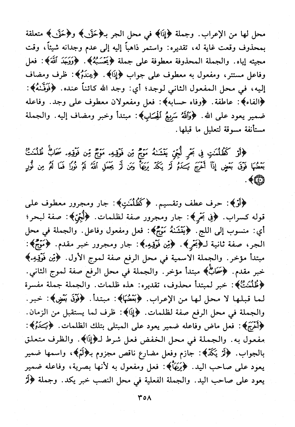 {أَوْ}: حرف عطف وتقسيم. {كَظُلُمَاتٍ}: جار ومجرور معطوف على قوله كسراب. {فِي بَحْر}: جار ومجرور صفة لظلمات. {لُجِّيٍّ}: صفة لبحر؛ أي: منسوب إلى اللج. {يَغْشَاهُ مَوْجٌ}: فعل ومفعول وفاعل. والجملة في محل الجر، صفة ثانية لـ {بَحْرٍ}. {مِنْ فَوْقِهِ}: جار ومجرور خبر مقدم. {مَوْجٌ}: مبتدأ مؤخر. والجملة الاسمية في محل الرفع صفة لموج الأول. {مِنْ فَوْقِهِ} خبر مقدم. {سَحَابٌ} مبتدأ مؤخر. والجملة في محل الرفع صفة لموج الثاني. {ظُلُمَاتٌ}: خبر لمبتدأ محذوف، تقديره: هذه ظلمات. والجملة جملة مفسرة لما قبلها لا محل لها من الإعراب. {بَعْضُهَا}: مبتدأ. {فَوْقَ بَعْضٍ}: خبر. والجملة في محل الرفع صفة لظلمات. {إِذَا}: ظرف لما يستقبل من الزمان. {أَخْرَجَ}: فعل ماض وفاعله ضمير يعود على المبتلى بتلك الظلمات. {يَدَهُ}: مفعول به. والجملة في محل الخفض فعل شرط لـ {إِذَا}. والظرف متعلق بالجواب. {لَمْ يَكَدْ}: جازم وفعل مضارع ناقص مجزوم بـ {لَمْ}، واسمها ضمير يعود على صاحب اليد. {يَرَاهَا}: فعل ومفعول به لأنها بصرية، وفاعله ضمير يعود على صاحب اليد. والجملة الفعلية في محل النصب خبر يكد. وجملة {لَمْ