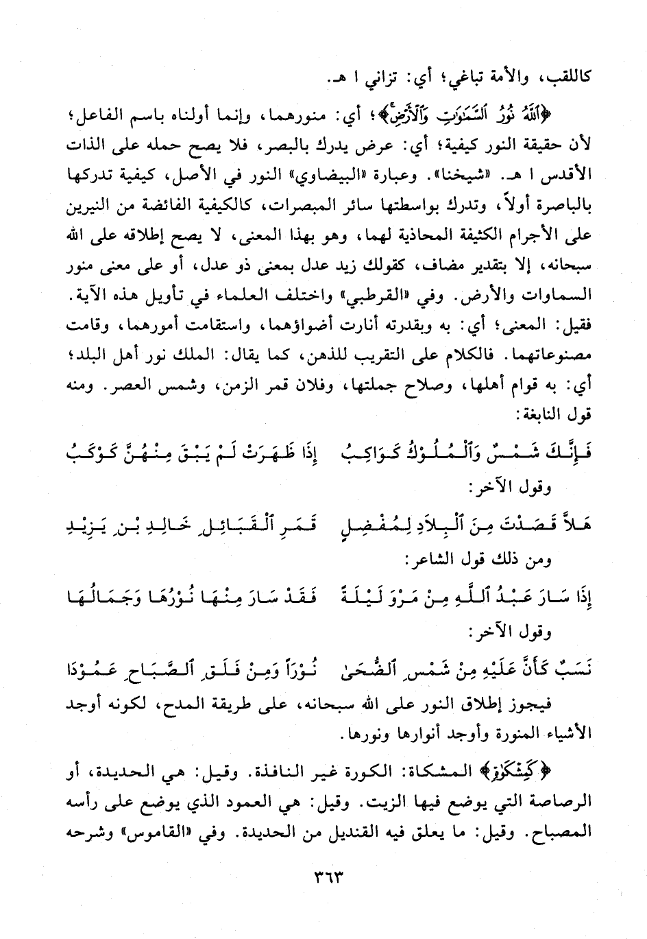 {اللَّهُ نُورُ السَّمَاوَاتِ وَالْأَرْضِ}؛ أي: منورهما، وإنما أولناه باسم الفاعل؛ لأن حقيقة النور كيفية؛ أي: عرض يدرك بالبصر، فلا يصح حمله على الذات الأقدس اهـ. "شيخنا". وعبارة "البيضاوي" النور في الأصل، كيفية تدركها بالباصرة أولًا، وتدرك بواسطتها سائر المبصرات، كالكيفية الفائضة من النيرين على الأجرام الكثيفة المحاذية لهما، وهو بهذا المعنى، لا يصح إطلاقه على الله سبحانه، إلا بتقدير مضاف، كقولك زيد عدل بمعنى ذو عدل، أو على معنى منور السماوات والأرض. وفي "القرطبي" واختلف العلماء في تأويل هذه الآية. فقيل: المعنى؛ أي: به وبقدرته أنارت أضواؤهما، واستقامت أمورهما، وقامت مصنوعاتهما. فالكلام على التقريب للذهن، كما يقال: الملك نور أهل البلد؛ أي: به قوام أهلها، وصلاح جملتها، وفلان قمر الزمن، وشمس العصر. ومنه قول النابغة: