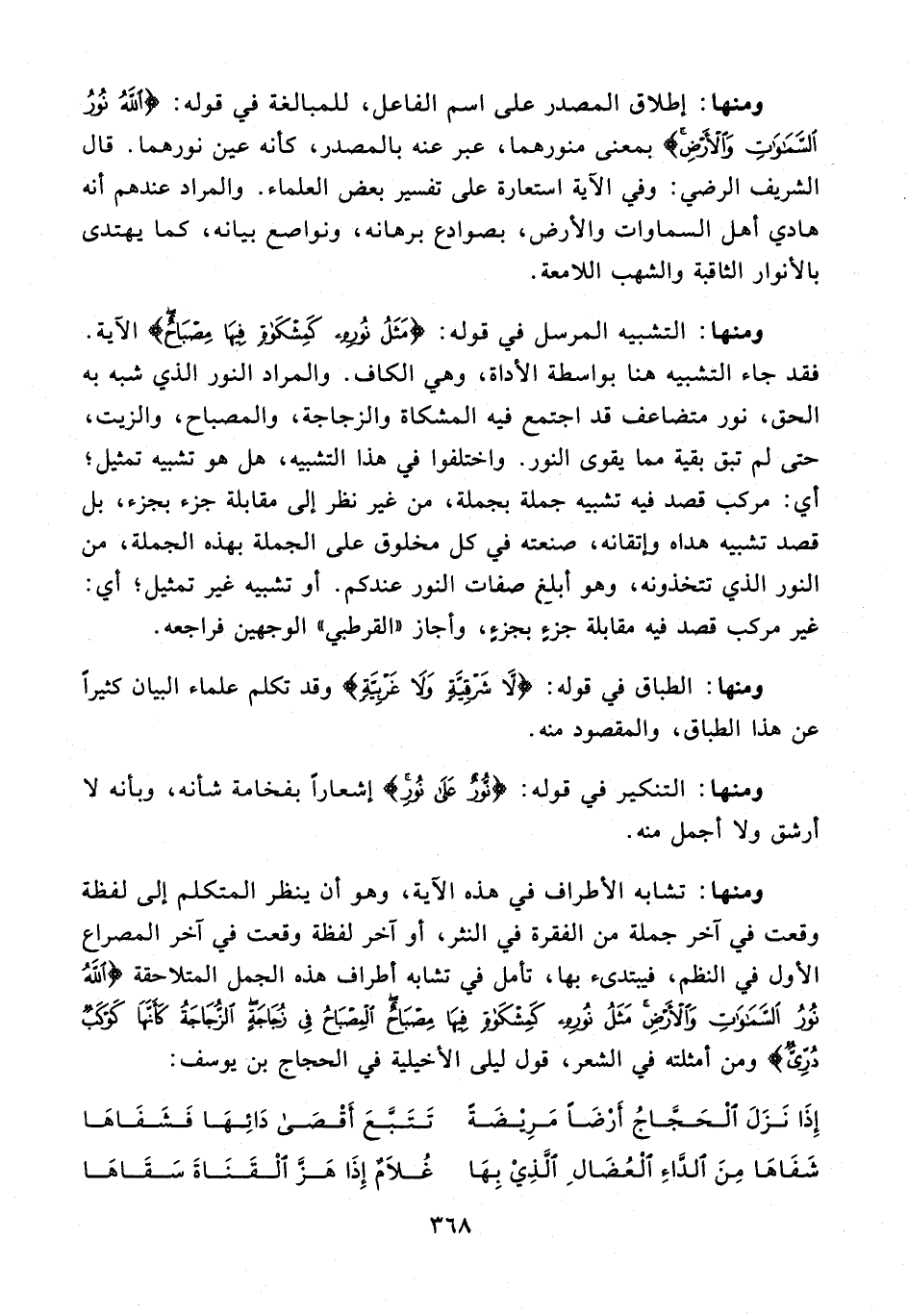 ومنها: تشابه الأطراف في هذه الآية، وهو أن ينظر المتكلم إلى لفظة وقعت في آخر جملة من الفقرة في النثر، أو آخر لفظة وقعت في آخر المصراع الأول في النظم، فيبتدىء بها، تأمل في تشابه أطراف هذه الجمل المتلاحقة {اللَّهُ نُورُ السَّمَاوَاتِ وَالْأَرْضِ مَثَلُ نُورِهِ كَمِشْكَاةٍ فِيهَا مِصْبَاحٌ الْمِصْبَاحُ فِي زُجَاجَةٍ الزُّجَاجَةُ كَأَنَّهَا كَوْكَبٌ دُرِّيٌّ} ومن أمثلته في الشعر، قول ليلى الأخيلية في الحجاج بن يوسف: