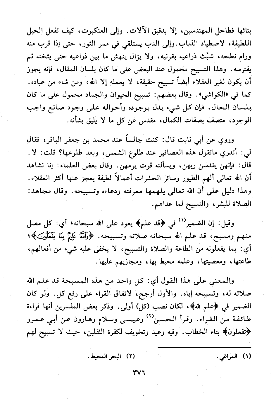 وروي عن أبي ثابت قال: كنت جالسًا عند محمد بن جعفر الباقر، فقال لي: أتدري ما تقول هذه العصافير عند طلوع الشمس، وبعد طلوعها؛ قلت: لا. قال: فإنهن يقدسن ربهن، ويسألنه قوت يومهن. وقال بعض العلماء: إنا نشاهد أن الله تعالى ألهم الطيور وسائر الحشرات أعمالًا لطيفة يعجز عنها أكثر العقلاء. وهذا دليل على أن الله تعالى يلهمها معرفته ودعاءه وتسبيحه. وقال مجاهد: الصلاة للبشر، والتسبيح لما عداهم.