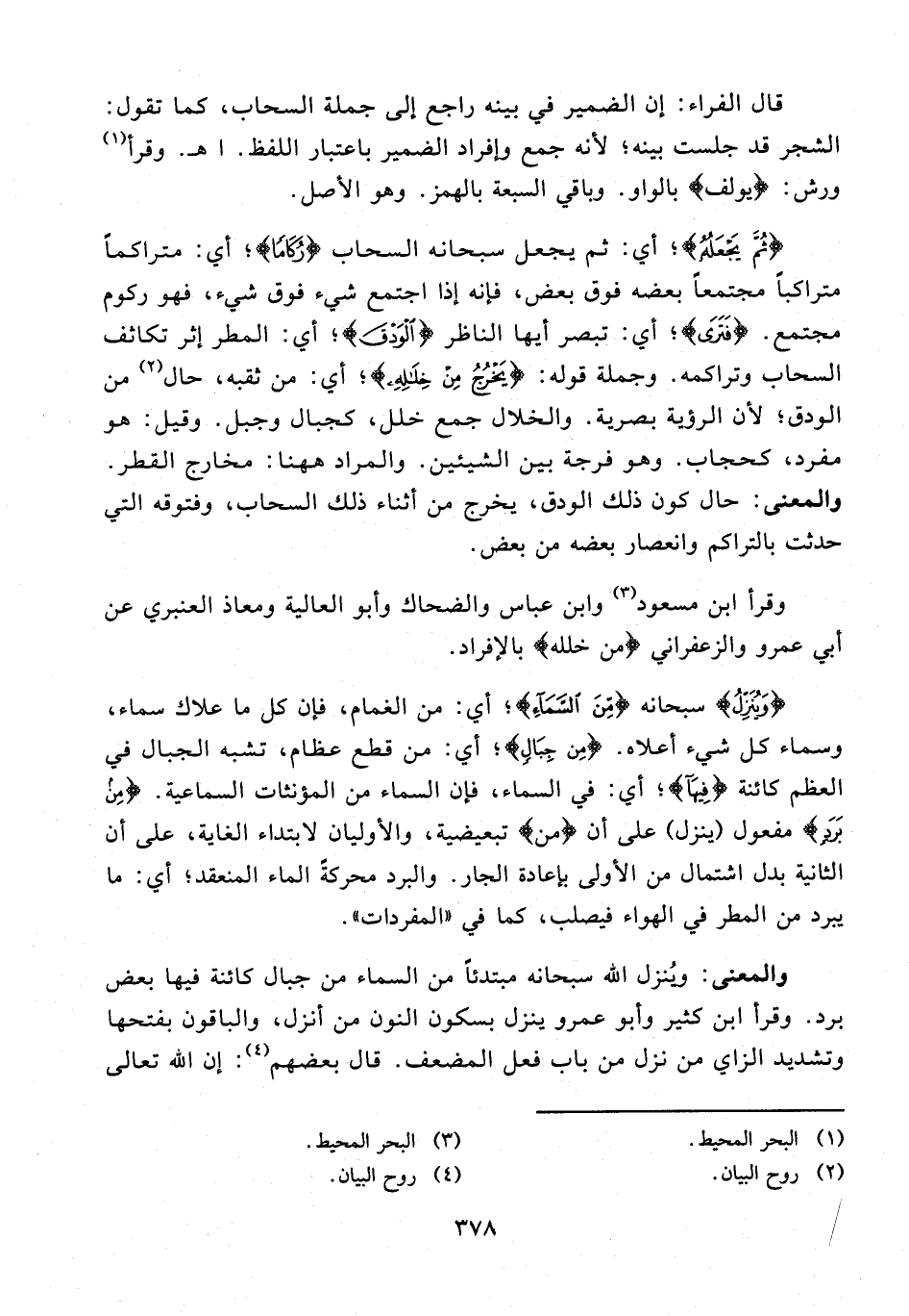 والمعنى: ويُنزل الله سبحانه مبتدئًا من السماء من جبال كائنة فيها بعض برد. وقرأ ابن كثير وأبو عمرو ينزل بسكون النون من أنزل، والباقون بفتحها وتشديد الزاي من نزل من باب فعل المضعف. قال بعضهم (¬4): إن الله تعالى